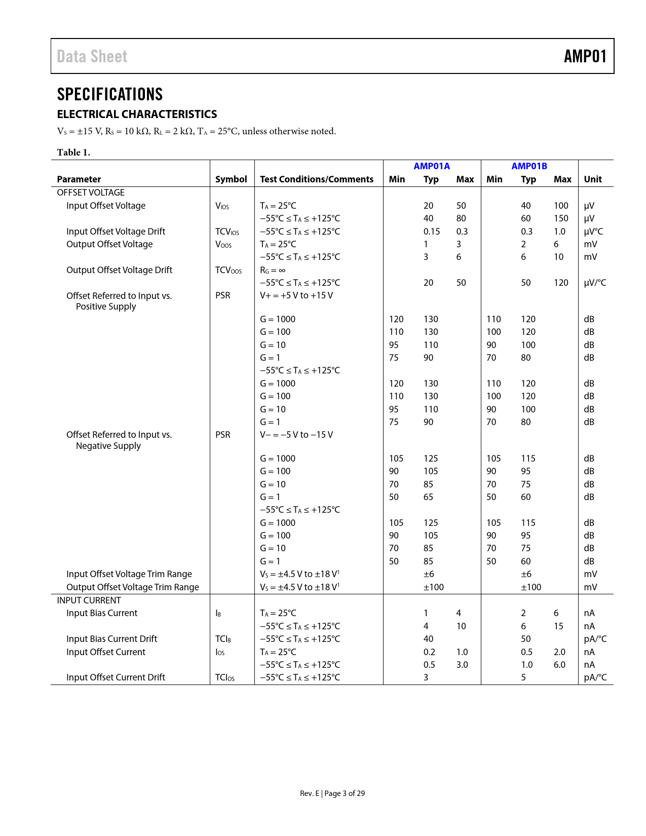 link to page 5 link to page 5 Data SheetAMP01SPECIFICATIONS ELECTRICAL CHARACTERISTICS VS = ±15 V, RS = 10 kΩ, RL = 2 kΩ, TA = 25°C, unless otherwise noted. Table 1.AMP01AAMP01BParameterSyTembol st Conditions/CommentsMin Typ MaxMin Typ MaxUnit OFFSET VOLTAGE Input Offset Voltage VIOS TA = 25°C 20 50 40 100 μV −55°C ≤ TA ≤ +125°C 40 80 60 150 μV Input Offset Voltage Drift TCVIOS −55°C ≤ TA ≤ +125°C 0.15 0.3 0.3 1.0 μV°C Output Offset Voltage VOOS TA = 25°C 1 3 2 6 mV −55°C ≤ TA ≤ +125°C 3 6 6 10 mV Output Offset Voltage Drift TCVOOS RG = ∞ −55°C ≤ TA ≤ +125°C 20 50 50 120 μV/°C Offset Referred to Input vs. PSR V+ = +5 V to +15 V Positive Supply G = 1000 120 130 110 120 dB G = 100 110 130 100 120 dB G = 10 95 110 90 100 dB G = 1 75 90 70 80 dB −55°C ≤ TA ≤ +125°C G = 1000 120 130 110 120 dB G = 100 110 130 100 120 dB G = 10 95 110 90 100 dB G = 1 75 90 70 80 dB Offset Referred to Input vs. PSR V− = −5 V to −15 V Negative Supply G = 1000 105 125 105 115 dB G = 100 90 105 90 95 dB G = 10 70 85 70 75 dB G = 1 50 65 50 60 dB −55°C ≤ TA ≤ +125°C G = 1000 105 125 105 115 dB G = 100 90 105 90 95 dB G = 10 70 85 70 75 dB G = 1 50 85 50 60 dB Input Offset Voltage Trim Range VS = ±4.5 V to ±18 V1 ±6 ±6 mV Output Offset Voltage Trim Range VS = ±4.5 V to ±18 V1 ±100 ±100 mV INPUT CURRENT Input Bias Current IB TA = 25°C 1 4 2 6 nA −55°C ≤ TA ≤ +125°C 4 10 6 15 nA Input Bias Current Drift TCIB −55°C ≤ TA ≤ +125°C 40 50 pA/°C Input Offset Current IOS TA = 25°C 0.2 1.0 0.5 2.0 nA −55°C ≤ TA ≤ +125°C 0.5 3.0 1.0 6.0 nA Input Offset Current Drift TCIOS −55°C ≤ TA ≤ +125°C 3 5 pA/°C Rev. E | Page 3 of 29 Document Outline FEATURES GENERAL DESCRIPTION FUNCTIONAL BLOCK DIAGRAM TABLE OF CONTENTS REVISION HISTORY SPECIFICATIONS ELECTRICAL CHARACTERISTICS DICE CHARACTERISTICS WAFER TEST LIMITS (AMP01NBC) ABSOLUTE MAXIMUM RATINGS THERMAL RESISTANCE ESD CAUTION PIN CONFIGURATIONS AND FUNCTION DESCRIPTIONS TYPICAL PERFORMANCE CHARACTERISTICS THEORY OF OPERATION INPUT AND OUTPUT OFFSET VOLTAGES INPUT BIAS AND OFFSET CURRENTS GAIN COMMON-MODE REJECTION ACTIVE GUARD DRIVE GROUNDING SENSE AND REFERENCE TERMINALS DRIVING 50 Ω LOADS HEATSINKING OVERVOLTAGE PROTECTION POWER SUPPLY CONSIDERATIONS APPLICATIONS CIRCUITS OUTLINE DIMENSIONS ORDERING GUIDE
