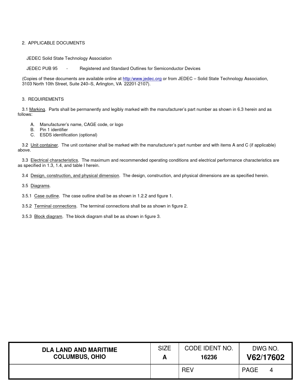 2. APPLICABLE DOCUMENTS JEDEC Solid State Technology Association JEDEC PUB 95 - Registered and Standard Outlines for Semiconductor Devices (Copies of these documents are available online at http:/www.jedec.org or from JEDEC – Solid State Technology Association, 3103 North 10th Street, Suite 240–S, Arlington, VA 22201-2107). 3. REQUIREMENTS 3.1 Marking. Parts shall be permanently and legibly marked with the manufacturer’s part number as shown in 6.3 herein and as follows: A. Manufacturer’s name, CAGE code, or logo B. Pin 1 identifier C. ESDS identification (optional) 3.2 Unit container. The unit container shall be marked with the manufacturer’s part number and with items A and C (if applicable) above. 3.3 Electrical characteristics. The maximum and recommended operating conditions and electrical performance characteristics are as specified in 1.3, 1.4, and table I herein. 3.4 Design, construction, and physical dimension. The design, construction, and physical dimensions are as specified herein. 3.5 Diagrams. 3.5.1 Case outline. The case outline shall be as shown in 1.2.2 and figure 1. 3.5.2 Terminal connections. The terminal connections shall be as shown in figure 2. 3.5.3 Block diagram. The block diagram shall be as shown in figure 3.