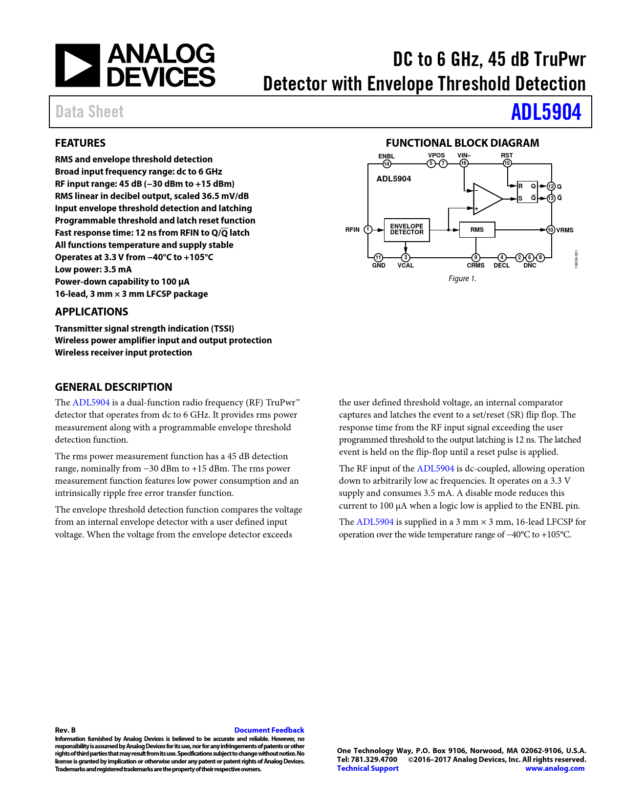 DC to 6 GHz, 45 dB TruPwr. Detector with Envelope Threshold Detection. Data Sheet. ADL5904. FEATURES. FUNCTIONAL BLOCK DIAGRAM