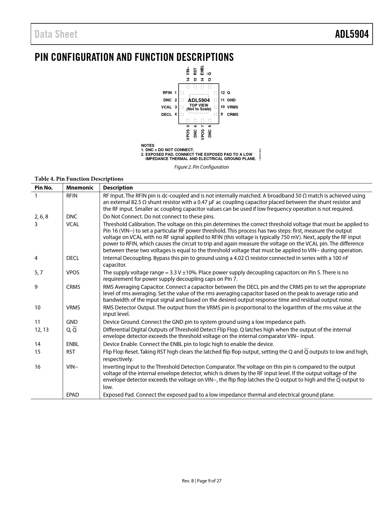 Data Sheet ADL5904 PIN CONFIGURATION AND FUNCTION DESCRIPTIONS IN– NBL RFIN 1 12 Q DNC 2 11 GND TOP VIEW VCAL 3 10 VRMS