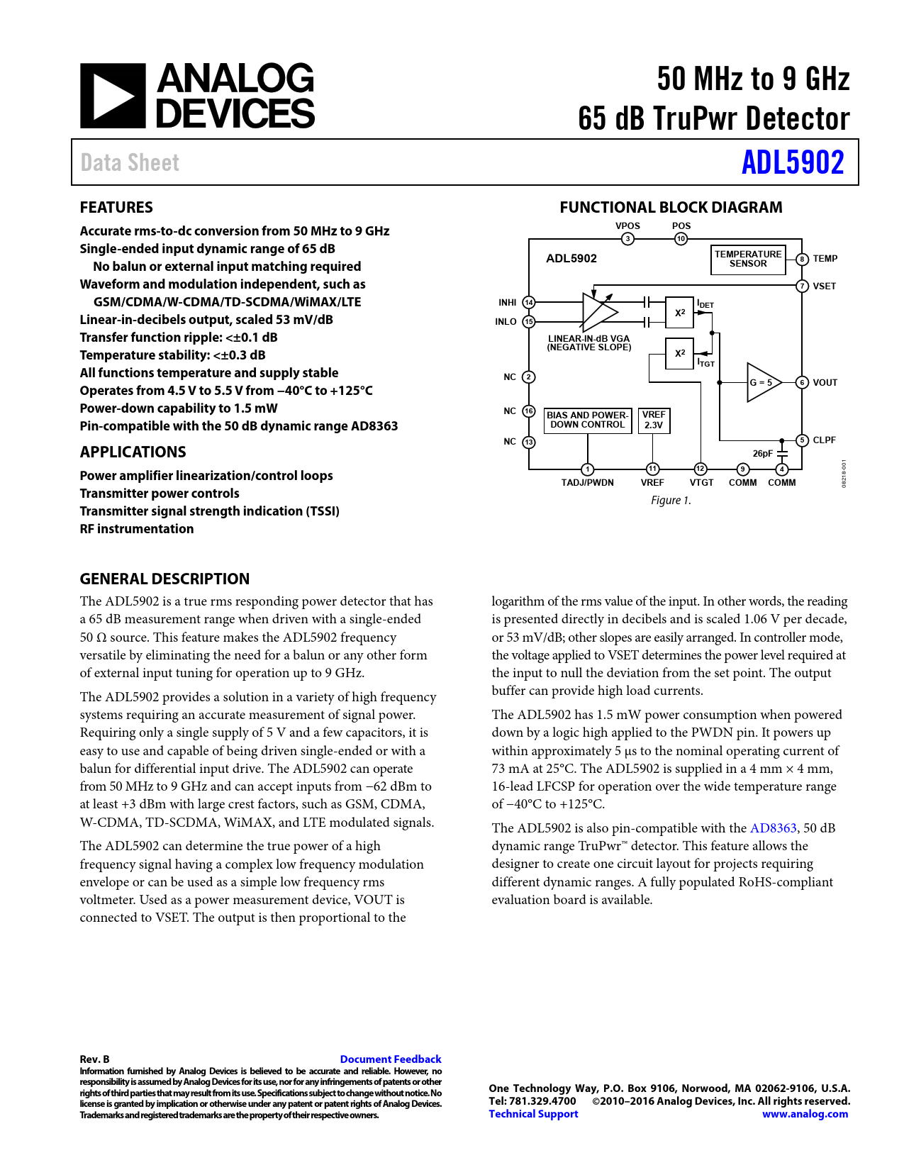 50 MHz to 9 GHz. 65 dB TruPwr Detector. Data Sheet. ADL5902. FEATURES. FUNCTIONAL BLOCK DIAGRAM. VPOS. POS