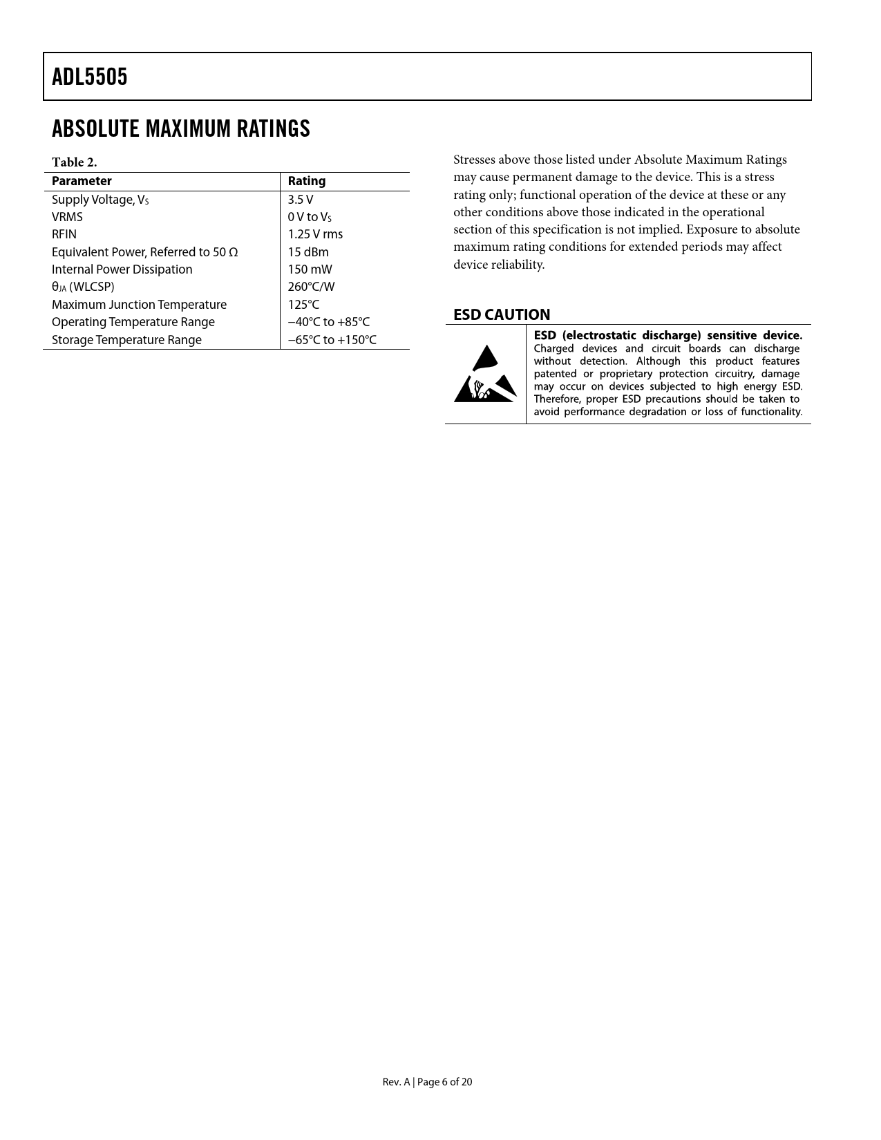 ADL5505ABSOLUTE MAXIMUM RATINGS Table 2. Stresses above those listed under Absolute Maximum Ratings ParameterRating may cause permanent damage to the device. This is a stress Supply Voltage, V rating only; functional operation of the device at these or any S 3.5 V VRMS 0 V to V other conditions above those indicated in the operational S RFIN 1.25 V rms section of this specification is not implied. Exposure to absolute Equivalent Power, Referred to 50 Ω 15 dBm maximum rating conditions for extended periods may affect Internal Power Dissipation 150 mW device reliability. θJA (WLCSP) 260°C/W Maximum Junction Temperature 125°C ESD CAUTION Operating Temperature Range −40°C to +85°C Storage Temperature Range −65°C to +150°C Rev. A | Page 6 of 20 Document Outline Features Applications Functional Block Diagram General Description Revision History Specifications Absolute Maximum Ratings ESD Caution Pin Configuration and Function Descriptions Typical Performance Characteristics Circuit Description RMS Circuit Description and Filtering Filtering Output Buffer Applications Information Basic Connections RF Input Interfacing Resistive Tap RF Input Multiple RF Inputs Linearity Output Swing Output Offset Output Drive Capability and Buffering Selecting the Output Low-Pass Filter Power Consumption Device Calibration and Error Calculation Calibration for Improved Accuracy Drift Over a Reduced Temperature Range Device Handling Land Pattern and Soldering Information Evaluation Board Outline Dimensions Ordering Guide