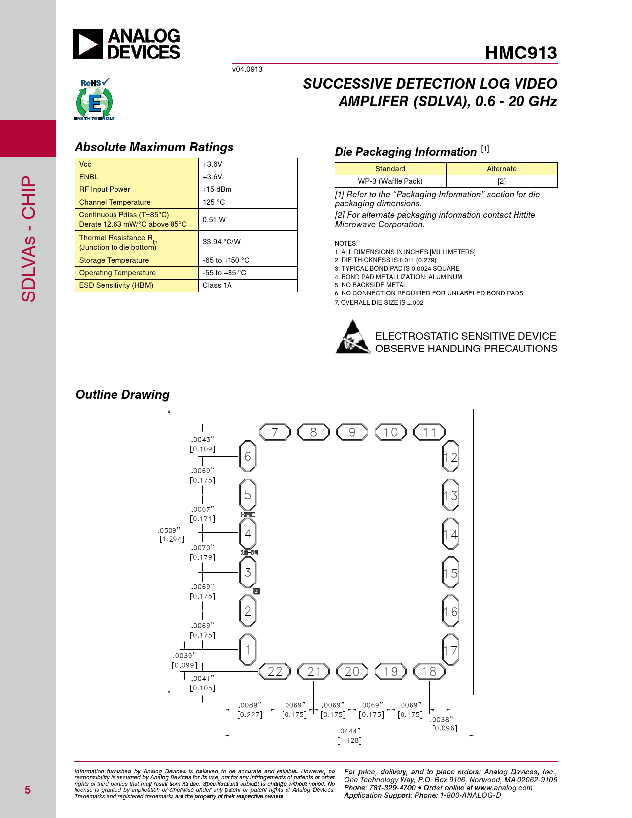 HMC913 v04.0913 SUCCESSIVE DETECTION LOG VIDEOAMPLIFER (SDLVA), 0.6 - 20 GHzAbsolute Maximum RatingsDie Packaging Information [1] Vcc +3.6V Standard Alternate IP ENBL +3.6V WP-3 (Waffle Pack) [2] H RF Input Power +15 dBm [1] Refer to the “Packaging Information” section for die Channel Temperature 125 °C packaging dimensions. C Continuous Pdiss (T=85°C) [2] For alternate packaging information contact Hittite - 0.51 W Derate 12.63 mW/°C above 85°C Microwave Corporation. Thermal Resistance R As th 33.94 °C/W NOTES: (Junction to die bottom) 1. ALL DIMENSIONS IN INCHES [MILLIMETERS] LV Storage Temperature -65 to +150 °C 2. DIE THICKNESS IS 0.011 (0.279) 3. TYPICAL BOND PAD IS 0.0024 SQUARE Operating Temperature -55 to +85 °C 4. BOND PAD METALLIZATION: ALUMINUM ESD Sensitivity (HBM) Class 1A 5. NO BACKSIDE METAL SD 6. NO CONNECTION REQUIRED FOR UNLABELED BOND PADS 7. OVERALL DIE SIZE IS ±.002 ELECTROSTATIC SENSITIVE DEVICE OBSERVE HANDLING PRECAUTIONS Outline Drawing Inf F or o m r p atio r n ifc ur e n , d ishe e d lbiv y e A r n y a alog n D d t evic o p es is la beclie o eved rd to ebre sa: H ccur iattti e tae M nd re ilicarbloew . H a o ve C wever, o n rp o For price, delivery, and to place orders: Analog Devices, Inc., responsibility is assumed by Analog Devices for its use, nor for any infringements of patents or other oration, 2 Elizabeth Drive, Chelmsford, MA 01824 One Technology Way, P.O. Box 9106, Norwood, MA 02062-9106 Phone: 978-250-3343 Fax: 978-250-3373 O rights of third parties that may result from its use. Specifications subject to change without notice. No P rd hone e r O : 7 n 81- -3li 2n 9 e a -47 t w 0 w 0 • O w rd .h e it r o t niltie n .c e ao t m 5 license is granted by implication or otherwise under any patent or patent rights of Analog Devices. www.analog.com Application Support: Pho Trademarks and registered trademarks are the property of their respective owners. ne: 978-250-33 A 4 p 3 p o lica rti a o p n S p u s p @ po h rt itt : P ite ho . n c e om : 1-800-ANALOG-D