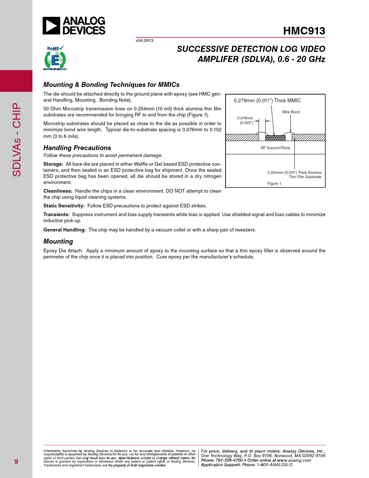 HMC913 v04.0913 SUCCESSIVE DETECTION LOG VIDEOAMPLIFER (SDLVA), 0.6 - 20 GHzMounting & Bonding Techniques for MMICs The die should be attached directly to the ground plane with epoxy (see HMC gen- eral Handling, Mounting , Bonding Note). 0.279mm (0.011”) Thick MMIC IP 50 Ohm Microstrip transmission lines on 0.254mm (10 mil) thick alumina thin film H substrates are recommended for bringing RF to and from the chip (Figure 1). Wire Bond 0.076mm C Microstrip substrates should be placed as close to the die as possible in order to (0.003”) - minimize bond wire length. Typical die-to-substrate spacing is 0.076mm to 0.152 mm (3 to 6 mils). As Handling Precautions RF Ground Plane LV Follow these precautions to avoid permanent damage. Storage: All bare die are placed in either Waffle or Gel based ESD protective con- SD tainers, and then sealed in an ESD protective bag for shipment. Once the sealed 0.254mm (0.010”) Thick Alumina ESD protective bag has been opened, all die should be stored in a dry nitrogen Thin Film Substrate environment. Figure 1. Cleanliness: Handle the chips in a clean environment. DO NOT attempt to clean the chip using liquid cleaning systems. Static Sensitivity: Follow ESD precautions to protect against ESD strikes. Transients: Suppress instrument and bias supply transients while bias is applied. Use shielded signal and bias cables to minimize inductive pick-up. General Handling: The chip may be handled by a vacuum collet or with a sharp pair of tweezers. Mounting Epoxy Die Attach: Apply a minimum amount of epoxy to the mounting surface so that a thin epoxy fillet is observed around the perimeter of the chip once it is placed into position. Cure epoxy per the manufacturer’s schedule. Inf F or o m r p atio r n ifc ur e n , d ishe e d lbiv y e A r n y a alog n D d t evic o p es is la beclie o eved rd to ebre sa: H ccur iattti e tae M nd re ilicarbloew . H a o ve C wever, o n rp o For price, delivery, and to place orders: Analog Devices, Inc., responsibility is assumed by Analog Devices for its use, nor for any infringements of patents or other oration, 2 Elizabeth Drive, Chelmsford, MA 01824 One Technology Way, P.O. Box 9106, Norwood, MA 02062-9106 Phone: 978-250-3343 Fax: 978-250-3373 O rights of third parties that may result from its use. Specifications subject to change without notice. No P rd hone e r O : 7 n 81- -3li 2n 9 e a -47 t w 0 w 0 • O w rd .h e it r o t niltie n .c e ao t m 9 license is granted by implication or otherwise under any patent or patent rights of Analog Devices. www.analog.com Application Support: Pho Trademarks and registered trademarks are the property of their respective owners. ne: 978-250-33 A 4 p 3 p o lica rti a o p n S p u s p @ po h rt itt : P ite ho . n c e om : 1-800-ANALOG-D