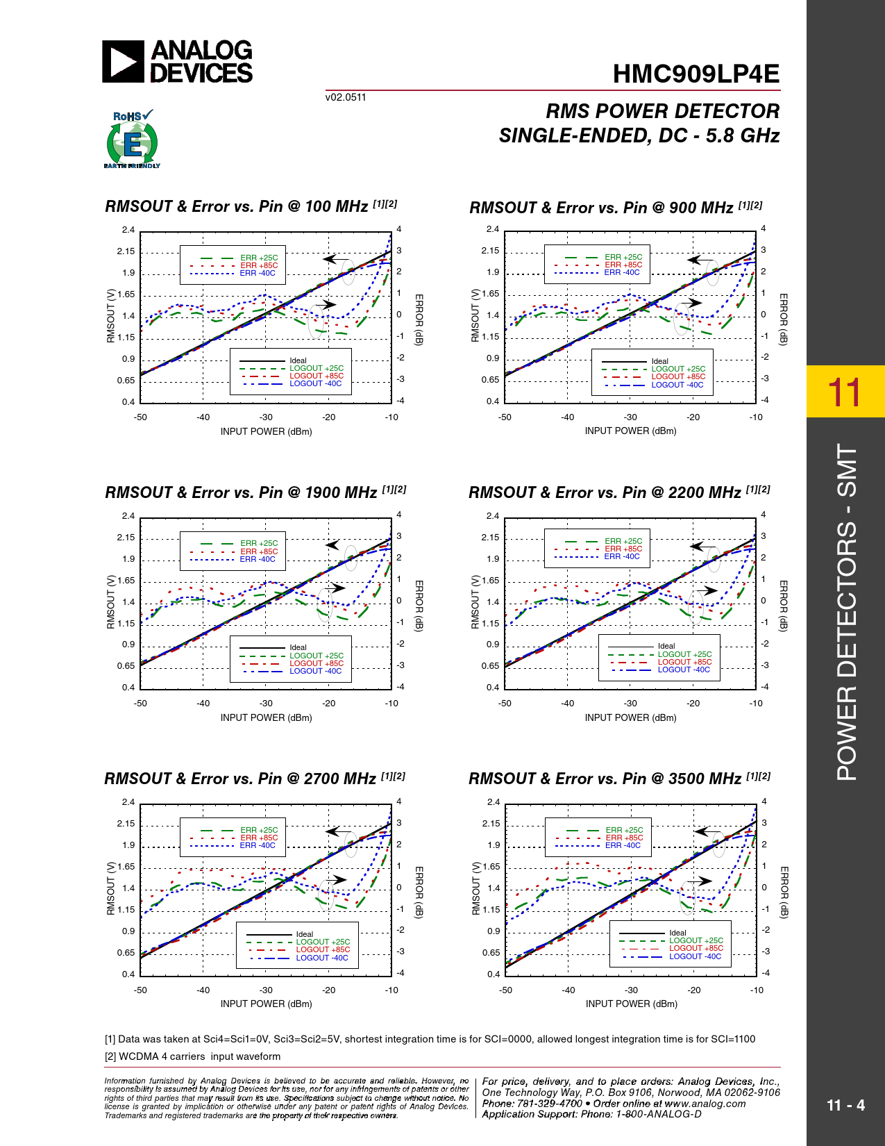 HMC909LP4E. RMS POWER DETECTOR. SINGLE-ENDED, DC - 5.8 GHz. RMSOUT & Error vs. Pin @ 100 MHz [1][2]