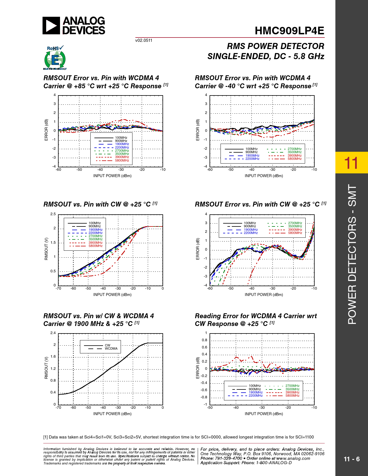 HMC909LP4E. RMS POWER DETECTOR. SINGLE-ENDED, DC - 5.8 GHz. RMSOUT Error vs. Pin with WCDMA 4