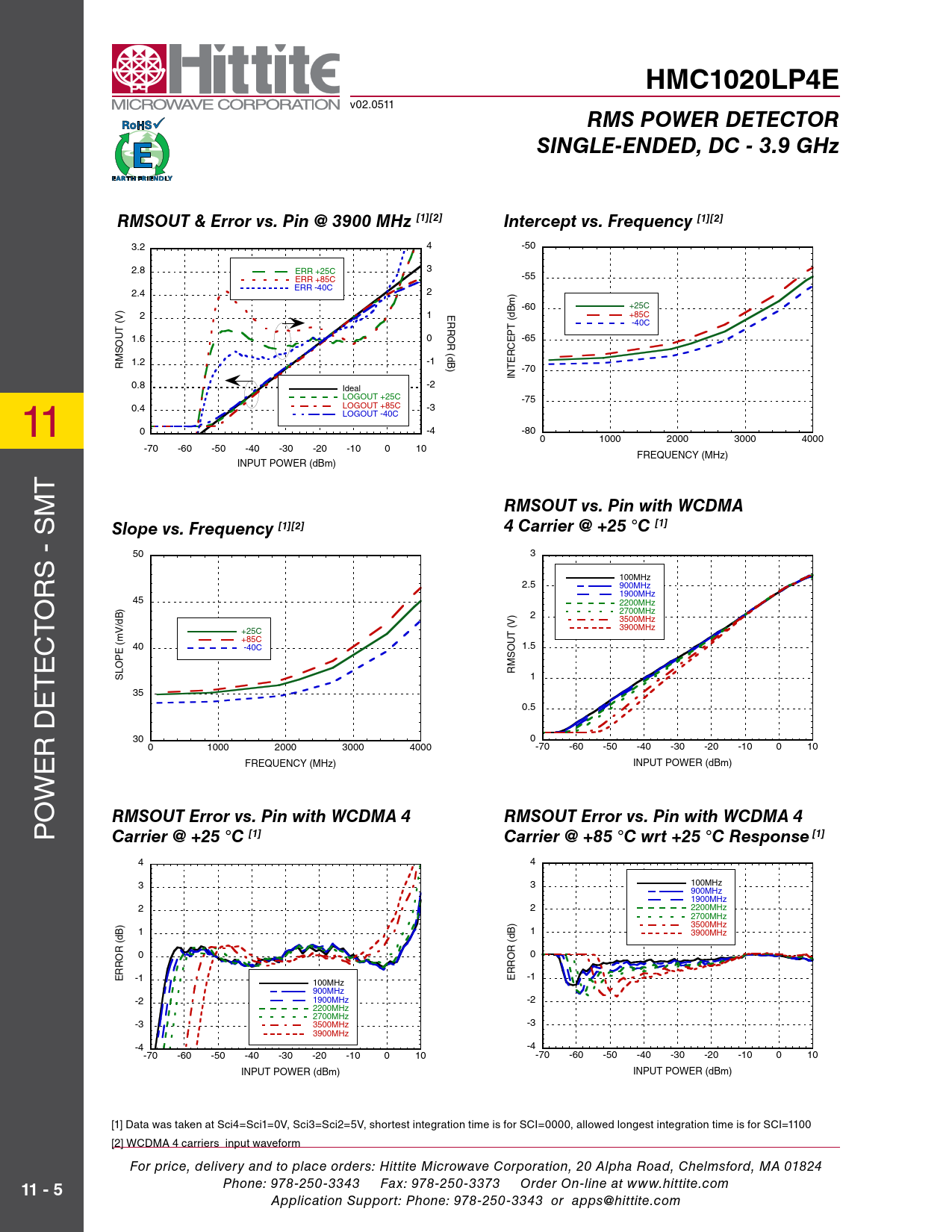 Application Support: Phone: 978-250-3343 or apps@hittite.com Document Outline Typical Applications Features Functional Diagram General Descriptions Electrical Specifications I Electrical Specifications II RMSOUT vs. Pin with Different Modulations @ 1900 MHz RMSOUT Error vs. Pin with Different Modulations @ 1900 MHz Electrical Specifications III Typical Performance Characteristics RMSOUT & Error vs. Pin @ 100 MHz RMSOUT & Error vs. Pin @ 900 MHz RMSOUT & Error vs. Pin @ 1900 MHz RMSOUT & Error vs. Pin @ 2200 MHz RMSOUT & Error vs. Pin @ 2700 MHz RMSOUT & Error vs. Pin @ 3500 MHz RMSOUT & Error vs. Pin @ 3900 MHz Intercept vs. Frequency Slope vs. Frequency RMSOUT vs. Pin with WCDMA 4 Carrier @ +25 °C RMSOUT Error vs. Pin with WCDMA 4 Carrier @ +25 °C RMSOUT Error vs. Pin with WCDMA 4 Carrier @ +85 °C wrt +25 °C Response RMSOUT Error vs. Pin with WCDMA 4 Carrier @ -40 °C wrt +25 °C Response RMSOUT vs. Pin with CW @ +25 °C RMSOUT Error vs. Pin with CW @ +25 °C RMSOUT vs. Pin w/ CW & WCDMA 4 Carrier @ 1900 MHz & +25 °C Reading Error for WCDMA 4 Carrier wrt CW Response @ +25 °C RMSOUT vs. Pin w/ CW & WCDMA 4 Carrier @ 1900 MHz & +85 °C Reading Error for WCDMA 4 Carrier wrt CW Response @ +85 °C RMSOUT vs. Pin w/ CW & WCDMA 4 Carrier @ 1900 MHz & -40 °C Reading Error for WCDMA 4 Carrier wrt CW Response @ -40 °C Output Response with SCI = 0000 @ 1900 MHz Output Response with SCI = 1100 @ 1900 MHz Typical Supply Current vs. Pin, Vcc = 5V Input Return Loss vs. Frequency Output Ripple & Rise/Fall Time vs. Integration Setting [Sci4,Sci3,Sci2,Sci1] in Decimal Absolute Maximum Ratings Outline Drawing Package Information Pin Descriptions Evaluation PCB List of Materials Evaluation Order Information Application Circuit Application Information Principle of Operation Configuration For The Typical Application Broadband Single-Ended Input Interface RMSOUT & Error vs. Pin RMS Output Interface and Transient Response Table 1: Transient Response vs. SCI Setting Rise Time vs. SCI Setting over Input Power Rise Settling Time vs. SCI Setting over Input Power Fall Time vs. SCI Setting over Input Power Residual Ripple for 900 Mhz WiMAX @ SCI=0100 Residual Ripple for 900 Mhz WiMAX @ SCI=0110 Residual Ripple for 900 Mhz WiBRO @ SCI=0100 Residual Ripple for 900 Mhz WiBRO @ SCI=0110 Residual Ripple for 900 Mhz LTE Downlink @ SCI=0100 Residual Ripple for 900 Mhz LTE Downlink @ SCI=0110 Residual Ripple for 900 Mhz WCDMA4 @ SCI=0011 Residual Ripple for 900 Mhz WCDMA4 @ SCI=0100 LOG-Slope and Intercept Slope Adjustment Intercept Adjustment DC Offset Compensation Loop Standby Mode Modulation Performance - Crest factor performance Reading Error for WCDMA 4 Carrier wrt CW Response @ +25 °C Reading Error for WCDMA 4 Carrier wrt CW Response @ 2200MHz RMSOUT Error vs. Crest Factor over Frequency System Calibration Layout Considerations Definitions