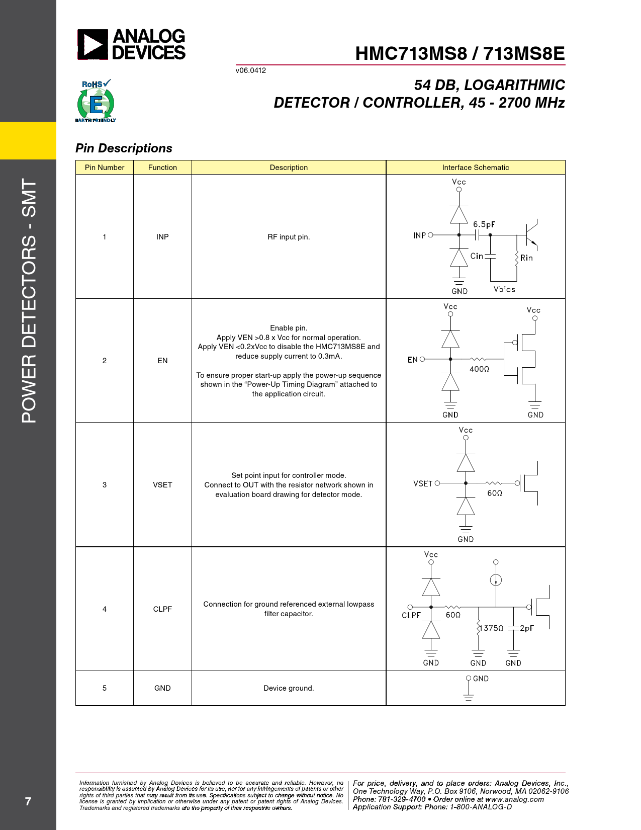 HMC713MS8 / 713MS8E. 54 DB, LOGARITHMIC. DETECTOR / CONTROLLER, 45 - 2700 MHz. Pin Descriptions