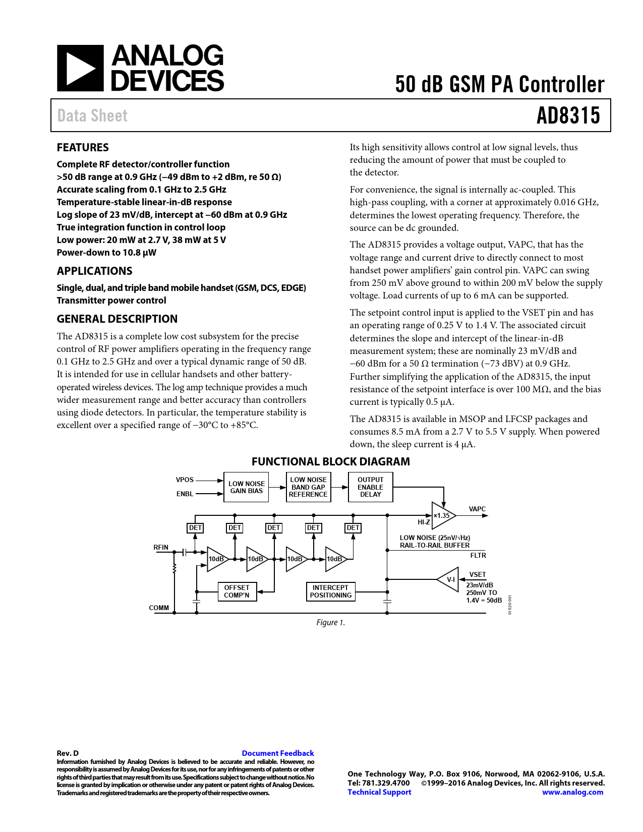 50 dB GSM PA Controller. Data Sheet. AD8315. FEATURES. Complete RF detector/controller function