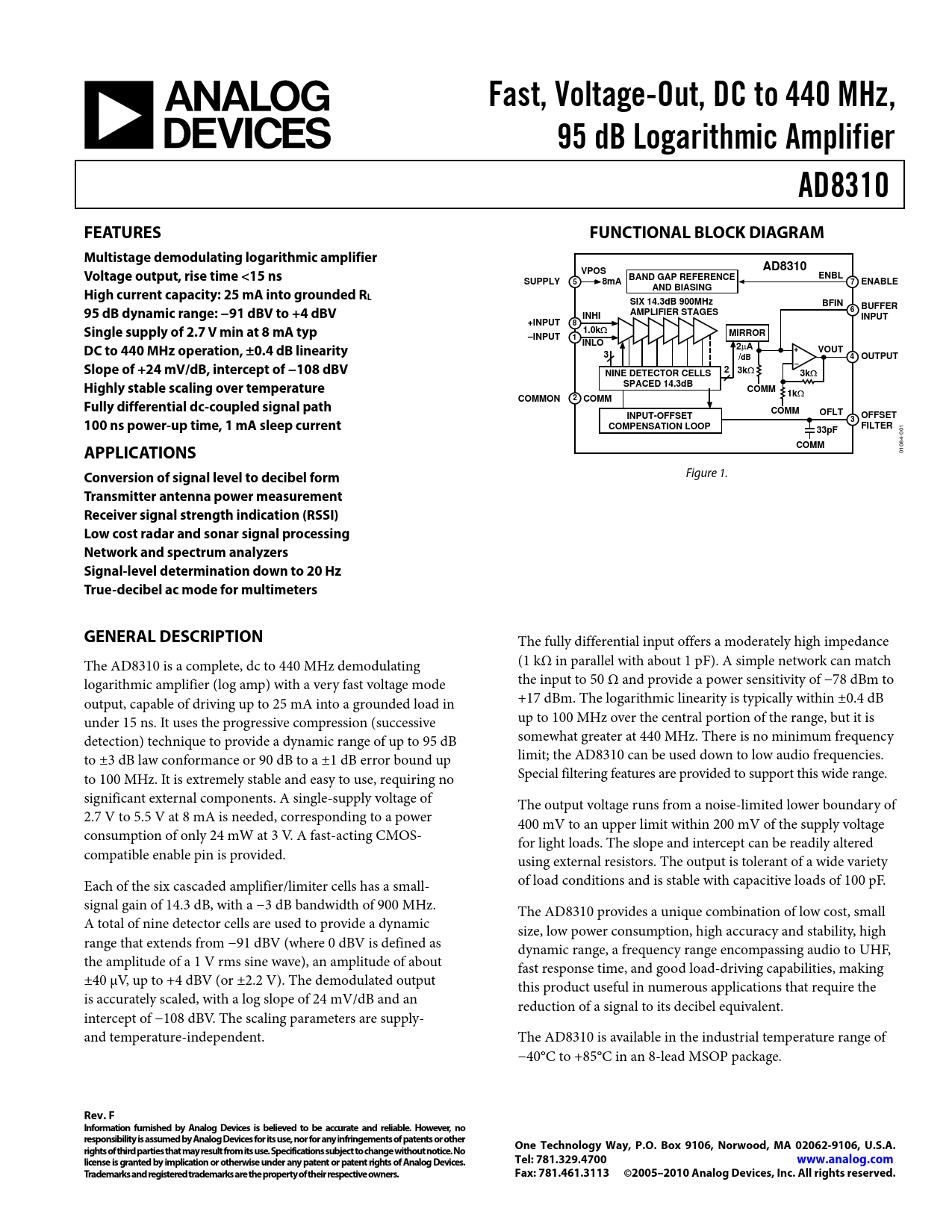 Fast, Voltage-Out, DC to 440 MHz,. 95 dB Logarithmic Amplifier. AD8310. FEATURES. FUNCTIONAL BLOCK DIAGRAM