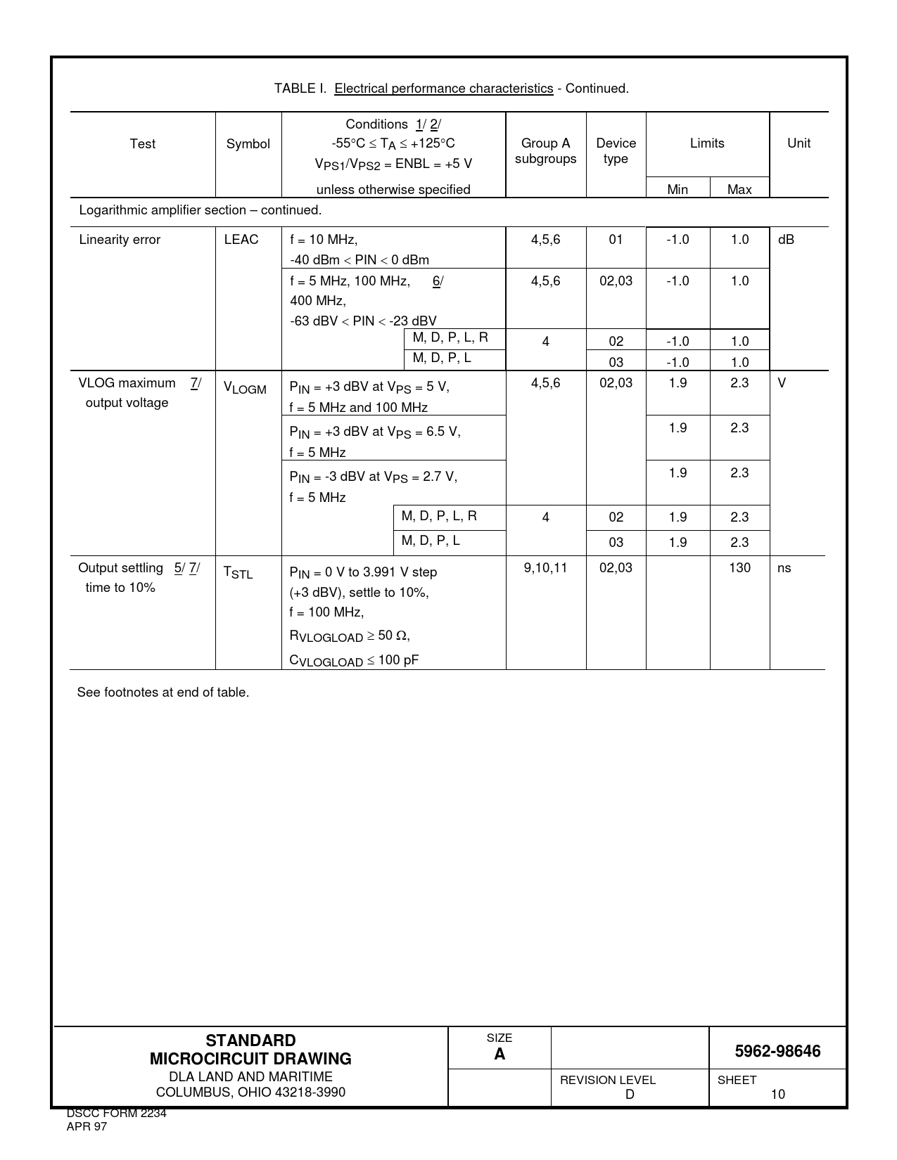 TABLE I. Electrical performance characteristics - Continued. Conditions 1/ 2/ Test Symbol -55°C ≤ TA ≤ +125°C Group A Device Limits Unit V subgroups type PS1/VPS2 = ENBL = +5 V unless otherwise specified Min Max Logarithmic amplifier section – continued. Linearity error LEAC f = 10 MHz, 4,5,6 01 -1.0 1.0 dB -40 dBm < PIN < 0 dBm f = 5 MHz, 100 MHz, 6/ 4,5,6 02,03 -1.0 1.0 400 MHz, -63 dBV < PIN < -23 dBV M, D, P, L, R 4 02 -1.0 1.0 M, D, P, L 03 -1.0 1.0 VLOG maximum 7/ V 4,5,6 02,03 1.9 2.3 V LOGM PIN = +3 dBV at VPS = 5 V, output voltage f = 5 MHz and 100 MHz P 1.9 2.3 IN = +3 dBV at VPS = 6.5 V, f = 5 MHz P 1.9 2.3 IN = -3 dBV at VPS = 2.7 V, f = 5 MHz M, D, P, L, R 4 02 1.9 2.3 M, D, P, L 03 1.9 2.3 Output settling 5/ 7/ T 9,10,11 02,03 130 ns STL PIN = 0 V to 3.991 V step time to 10% (+3 dBV), settle to 10%, f = 100 MHz, RVLOGLOAD ≥ 50 Ω, CVLOGLOAD ≤ 100 pF See footnotes at end of table.
