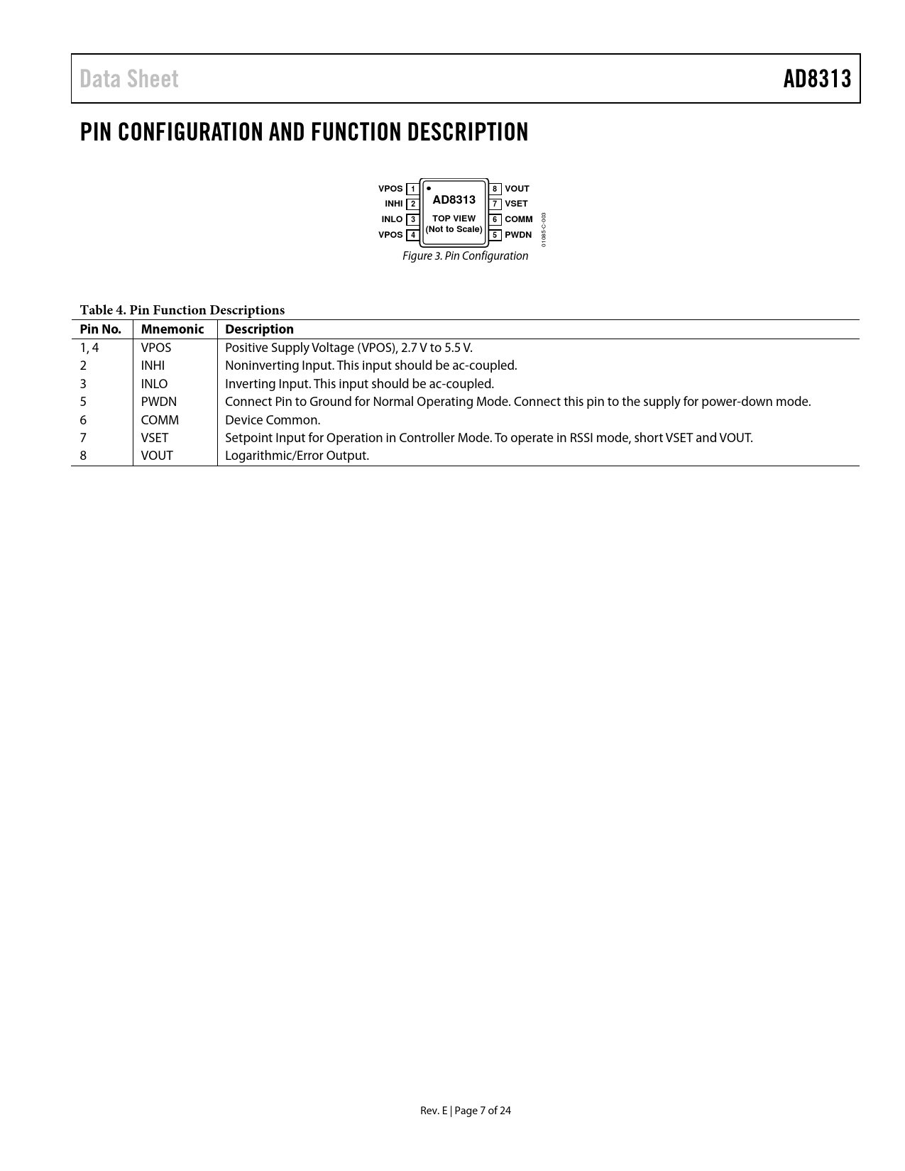 Data Sheet AD8313 PIN CONFIGURATION AND FUNCTION DESCRIPTION VPOS 1 8 VOUT INHI AD8313 2 7 VSET INLO 3 TOP VIEW 6 COMM (Not to Scale) VPOS 4 5 PWDN
