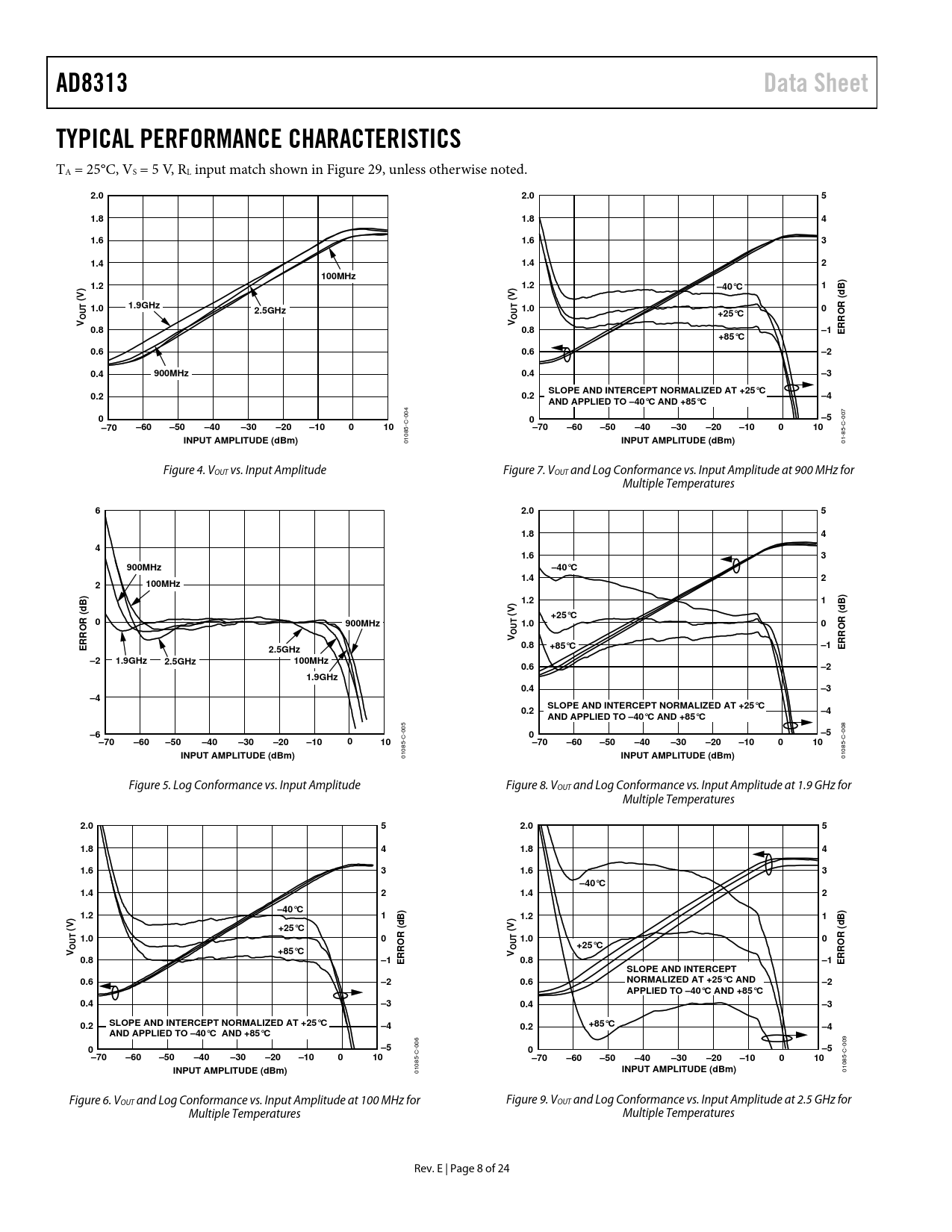 AD8313. Data Sheet. TYPICAL PERFORMANCE CHARACTERISTICS. 2.0. 1.8. 1.6. 1.4. 100MHz. 1.2. –40°C. (V). 1.0. 1.9GHz. 2.5GHz. +25°C. OUT. 0.8. ERROR (dB)
