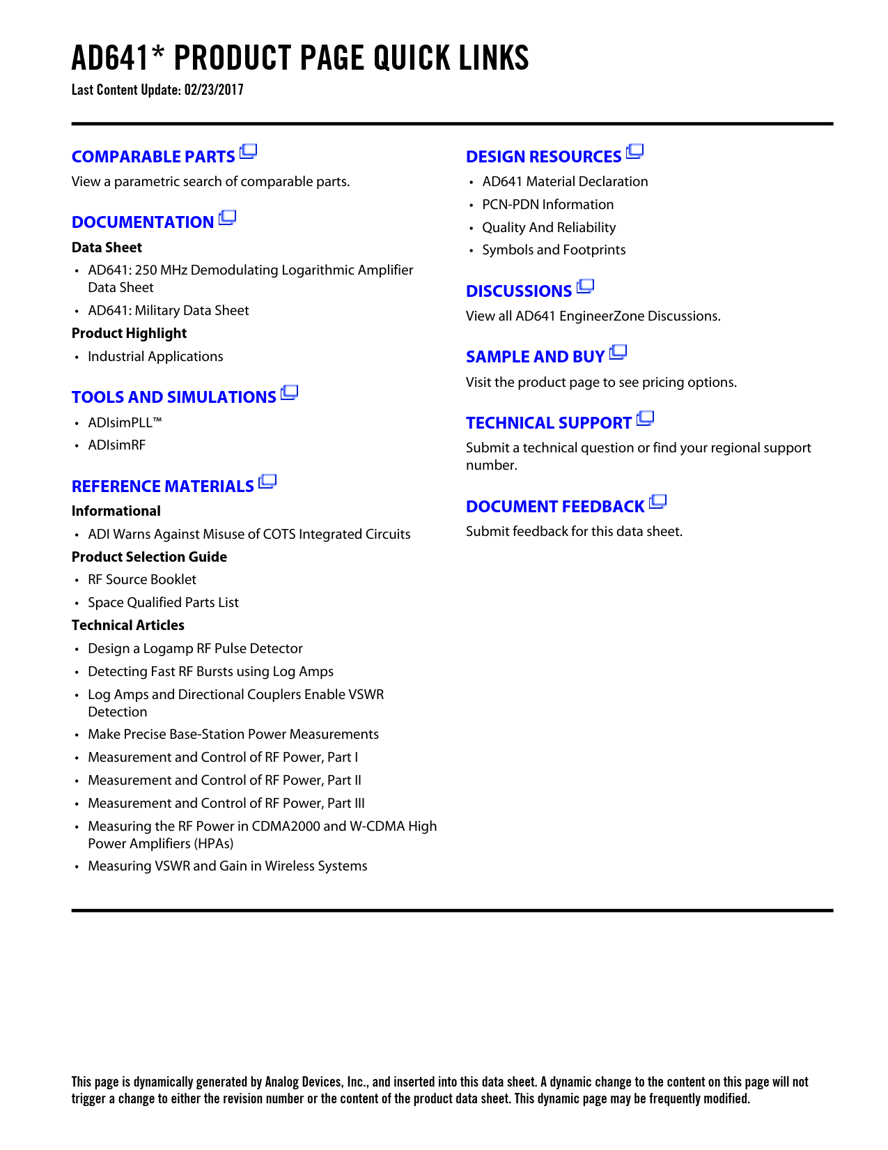 AD641* PRODUCT PAGE QUICK LINKS Last Content Update: 02/23/2017COMPARABLE PARTSDESIGN RESOURCES View a parametric search of comparable parts. • AD641 Material Declaration • PCN-PDN Information DOCUMENTATION • Quality And Reliability Data Sheet • Symbols and Footprints • AD641: 250 MHz Demodulating Logarithmic Amplifier Data Sheet DISCUSSIONS • AD641: Military Data Sheet View all AD641 EngineerZone Discussions. Product Highlight • Industrial Applications SAMPLE AND BUY Visit the product page to see pricing options. TOOLS AND SIMULATIONS • ADIsimPLL™ TECHNICAL SUPPORT • ADIsimRF Submit a technical question or find your regional support number. REFERENCE MATERIALSInformationalDOCUMENT FEEDBACK • ADI Warns Against Misuse of COTS Integrated Circuits Submit feedback for this data sheet. Product Selection Guide • RF Source Booklet • Space Qualified Parts List Technical Articles • Design a Logamp RF Pulse Detector • Detecting Fast RF Bursts using Log Amps • Log Amps and Directional Couplers Enable VSWR Detection • Make Precise Base-Station Power Measurements • Measurement and Control of RF Power, Part I • Measurement and Control of RF Power, Part II • Measurement and Control of RF Power, Part III • Measuring the RF Power in CDMA2000 and W-CDMA High Power Amplifiers (HPAs) • Measuring VSWR and Gain in Wireless Systems This page is dynamically generated by Analog Devices, Inc., and inserted into this data sheet. A dynamic change to the content on this page will not trigger a change to either the revision number or the content of the product data sheet. This dynamic page may be frequently modified. Document Outline FEATURES PRODUCT DESCRIPTION PIN CONFIGURATIONS AD641--SPECIFICATIONS ELECTRICAL CHARACTERISTICS THERMAL CHARACTERISTICS ABSOLUTE MAXIMUM RATINGS ESD CAUTION REVISION HISTORY AD641--TYPICAL DC PERFORMANCE CHARACTERISTICS TYPICAL AC PERFORMANCE CHARACTERISTICS CIRCUIT DESCRIPTION CIRCUIT OPERATION FUNDAMENTALS OF LOGARITHMIC CONVERSION INTERCEPT STABILIZATION CONVERSION RANGE EFFECT OF WAVEFORM ON INTERCEPT LOGARITHMIC CONFORMANCE AND WAVEFORM SIGNAL MAGNITUDE INTERCEPT AND LOGARITHMIC OFFSET OPERATION OF A SINGLE AD641 ACTIVE CURENT-TO-VOLTAGE CONVERSION EFFECT OF FREQUENCY ON CALIBRATION SOURCE RESISTANCE AND INPUT OFFSET USING HIGHER SUPPLY VOLTAGES USING THE ATTENUATOR OPERATION OF CASCADED AD641s ELIMINATING THE EFFECT OF FIRST STAGE OFFSET PRACTICAL APPLICATIONS RSSI APPLICATIONS 250 MHz RSSI CONVERTER WITH 58 dB DYNAMIC RANGE OUTLINE DIMENSIONS ORDERING GUIDE