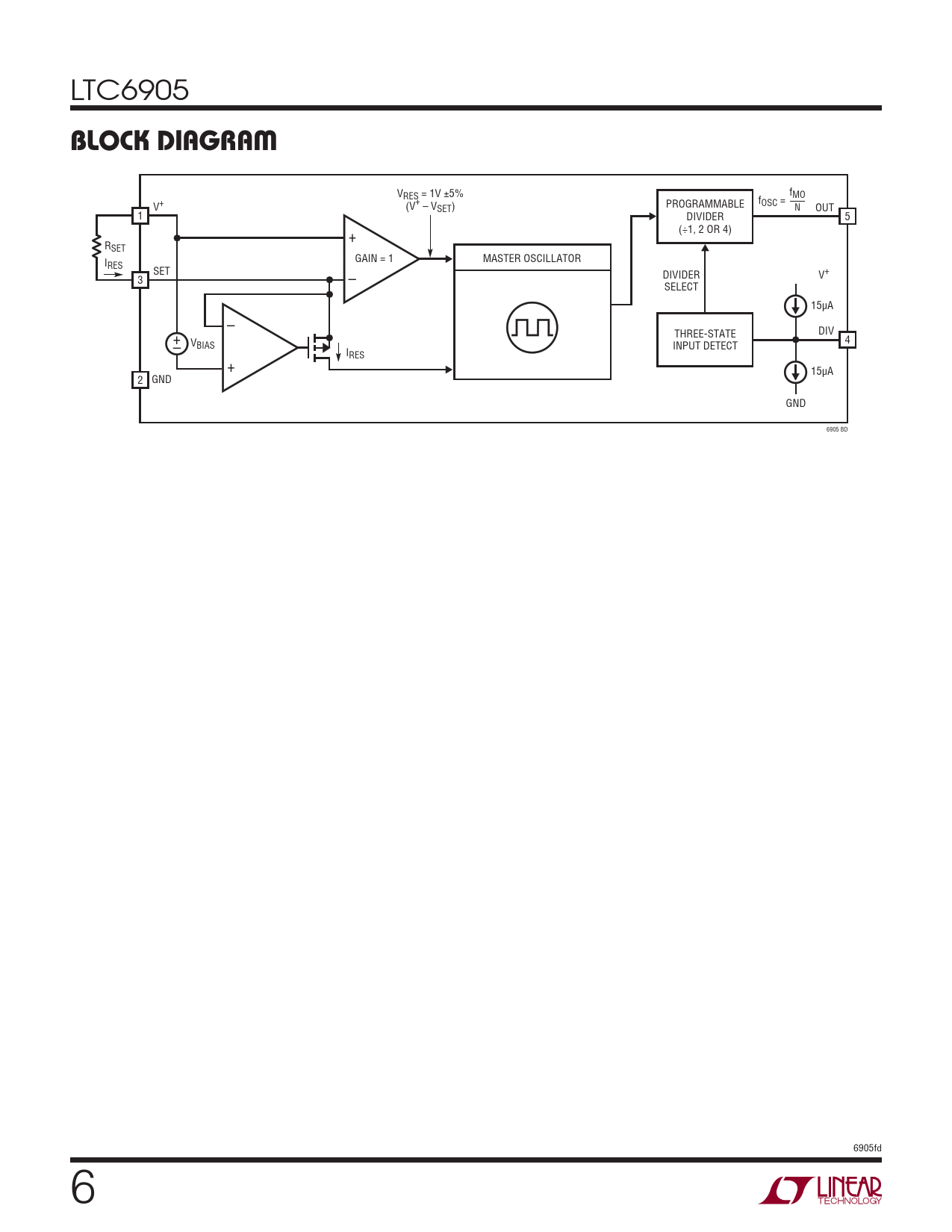VRES = 1V ±5% f f MO V+ (V+ – V PROGRAMMABLE OSC = SET) N OUT 1 DIVIDER 5 (÷1, 2 OR 4) + RSET GAIN = 1 I MASTER OSCILLATOR RES SET DIVIDER 3 – V+ SELECT 15μA – DIV + THREE-STATE 4 – VBIAS INPUT DETECT IRES + 15μA 2 GND GND 6905 BD 6905fd 6