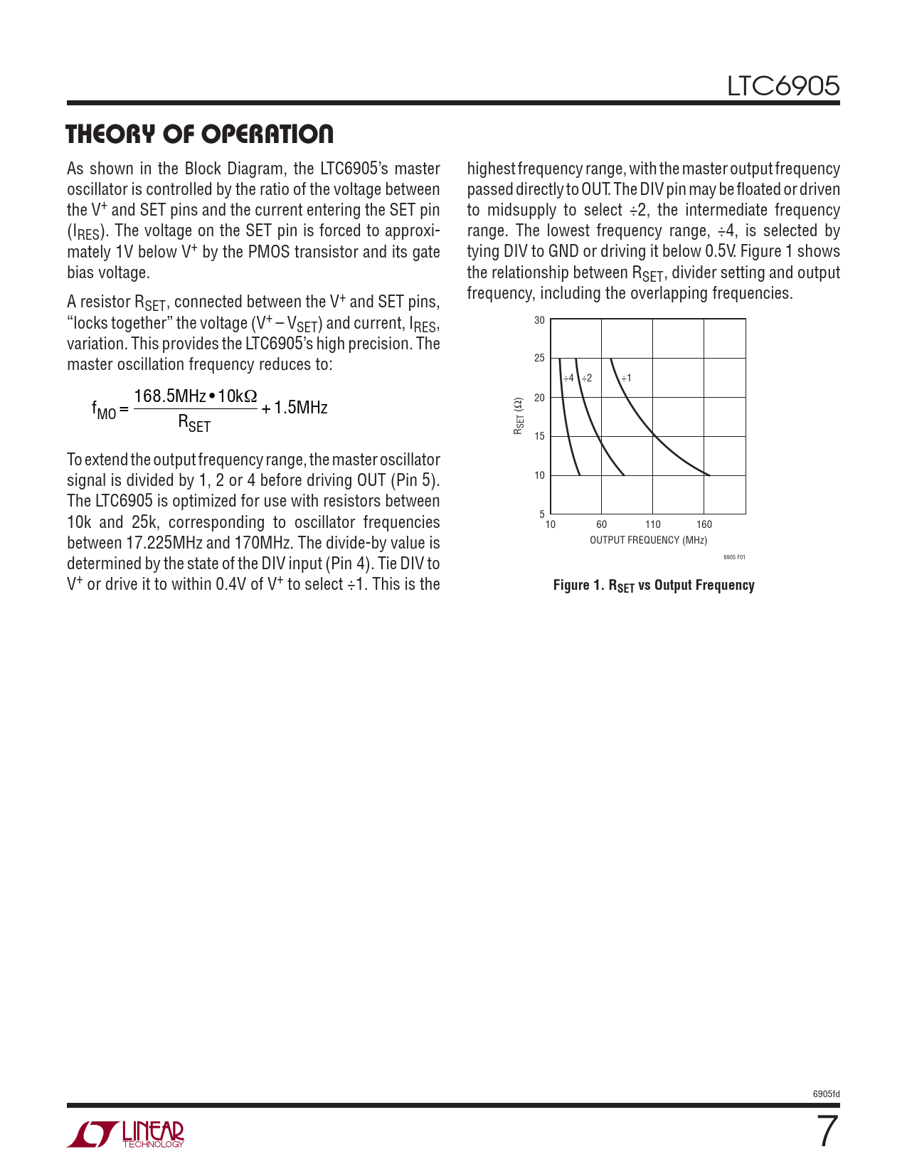 LTC6905 THEORY OF OPERATION As shown in the Block Diagram, the LTC6905’s master highest frequency range, with the master output frequency oscillator is controlled by the ratio of the voltage between passed directly to OUT. The DIV pin may be fl oated or driven the V+ and SET pins and the current entering the SET pin to midsupply to select ÷2, the intermediate frequency (IRES). The voltage on the SET pin is forced to approxi- range. The lowest frequency range, ÷4, is selected by mately 1V below V+ by the PMOS transistor and its gate tying DIV to GND or driving it below 0.5V. Figure 1 shows bias voltage. the relationship between RSET , divider setting and output frequency, including the overlapping frequencies. A resistor RSET , connected between the V+ and SET pins, “locks together” the voltage (V+ – V 30 SET) and current, IRES, variation. This provides the LTC6905’s high precision. The master oscillation frequency reduces to: 25 ÷4 ÷2 ÷1 168. MHz 5 • 1 k 0 Ω 20 f = + 1. MHz MO 5 (Ω) R SET SETR 15 To extend the output frequency range, the master oscillator signal is divided by 1, 2 or 4 before driving OUT (Pin 5). 10 The LTC6905 is optimized for use with resistors between 10k and 25k, corresponding to oscillator frequencies 510 60 110 160 between 17.225MHz and 170MHz. The divide-by value is OUTPUT FREQUENCY (MHz) determined by the state of the DIV input (Pin 4). Tie DIV to 6905 F01 V+ or drive it to within 0.4V of V+ to select ÷1. This is the Figure 1. RSET vs Output Frequency 6905fd 7