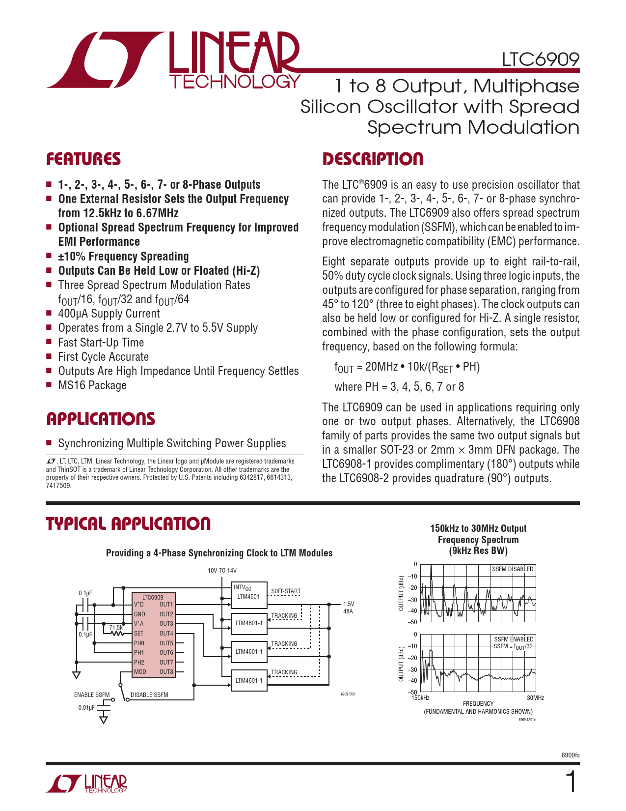 LTC6909 1 to 8 Output, Multiphase Silicon Oscillator with Spread Spectrum Modulation FeAturesDescription n 1-, 2-, 3-, 4-, 5-, 6-, 7- or 8-Phase Outputs The LTC®6909 is an easy to use precision oscillator that n One External Resistor Sets the Output Frequency can provide 1-, 2-, 3-, 4-, 5-, 6-, 7- or 8-phase synchro- from 12.5kHz to 6.67MHz nized outputs. The LTC6909 also offers spread spectrum n Optional Spread Spectrum Frequency for Improved frequency modulation (SSFM), which can be enabled to im- EMI Performance prove electromagnetic compatibility (EMC) performance. n ±10% Frequency Spreading Eight separate outputs provide up to eight rail-to-rail, n Outputs Can Be Held Low or Floated (Hi-Z) 50% duty cycle clock signals. Using three logic inputs, the n Three Spread Spectrum Modulation Rates outputs are configured for phase separation, ranging from fOUT/16, fOUT/32 and fOUT/64 45° to 120° (three to eight phases). The clock outputs can n 400µA Supply Current also be held low or configured for Hi-Z. A single resistor, n Operates from a Single 2.7V to 5.5V Supply combined with the phase configuration, sets the output n Fast Start-Up Time frequency, based on the following formula: n First Cycle Accurate n f Outputs Are High Impedance Until Frequency Settles OUT = 20MHz • 10k/(RSET • PH) n MS16 Package where PH = 3, 4, 5, 6, 7 or 8 The LTC6909 can be used in applications requiring only ApplicAtions one or two output phases. Alternatively, the LTC6908 family of parts provides the same two output signals but n Synchronizing Multiple Switching Power Supplies in a smaller SOT-23 or 2mm × 3mm DFN package. The L, LT, LTC, LTM, Linear Technology, the Linear logo and µModule are registered trademarks LTC6908-1 provides complimentary (180°) outputs while and ThinSOT is a trademark of Linear Technology Corporation. All other trademarks are the property of their respective owners. Protected by U.S. Patents including 6342817, 6614313, the LTC6908-2 provides quadrature (90°) outputs. 7417509. typicAl ApplicAtion150kHz to 30MHz OutputFrequency SpectrumProviding a 4-Phase Synchronizing Clock to LTM Modules(9kHz Res BW) 0 10V TO 14V SSFM DISABLED –10 INTVCC –20 0.1µF S0FT-START LTC6909 LTM4601 –30 V+D OUT1 1.5V 48A OUTPUT (dBc) GND OUT2 –40 TRACKING V+A OUT3 LTM4601-1 –50 71.5k 0.1µF SET OUT4 0 SSFM ENABLED PH0 OUT5 TRACKING –10 SSFM = fOUT/32 PH1 OUT6 LTM4601-1 –20 PH2 OUT7 MOD OUT8 TRACKING –30 LTM4601-1 OUTPUT (dBc) –40 ENABLE SSFM DISABLE SSFM 6909 TA01 –50 150kHz 30MHz FREQUENCY 0.01µF (FUNDAMENTAL AND HARMONICS SHOWN) 6909 TA01b 6909fa 1 Document Outline Features Applications Description Typical Application Absolute Maximum Ratings Pin Configuration Order Information Electrical Characteristics Typical Performance Characteristics Pin Functions Block Diagram Operation Applications Information Typical Applications Package Description Revision History Typical Application Related Parts