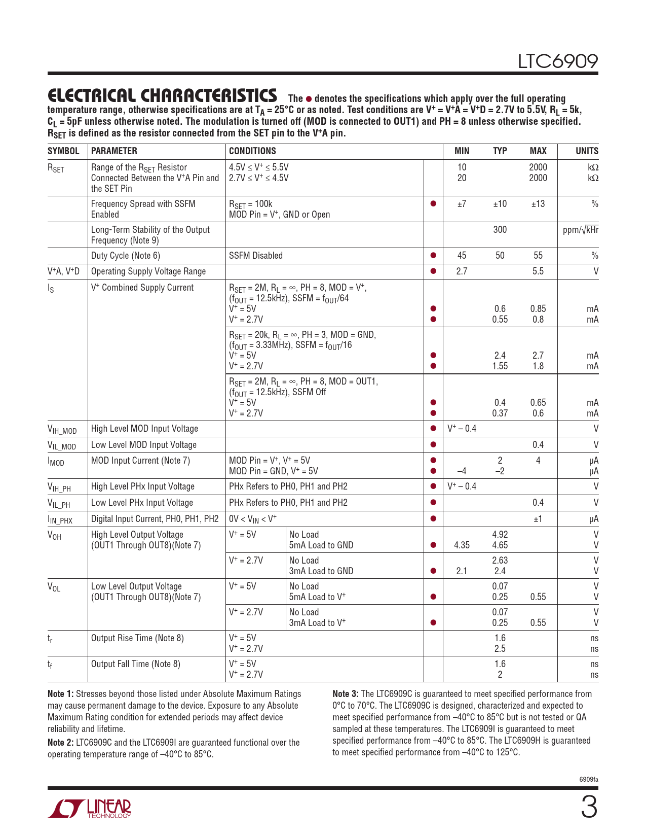 LTC6909C and the LTC6909I are guaranteed functional over the specified performance from –40°C to 85°C. The LTC6909H is guaranteed operating temperature range of –40°C to 85°C. to meet specified performance from –40°C to 125°C. 6909fa 3 Document Outline Features Applications Description Typical Application Absolute Maximum Ratings Pin Configuration Order Information Electrical Characteristics Typical Performance Characteristics Pin Functions Block Diagram Operation Applications Information Typical Applications Package Description Revision History Typical Application Related Parts