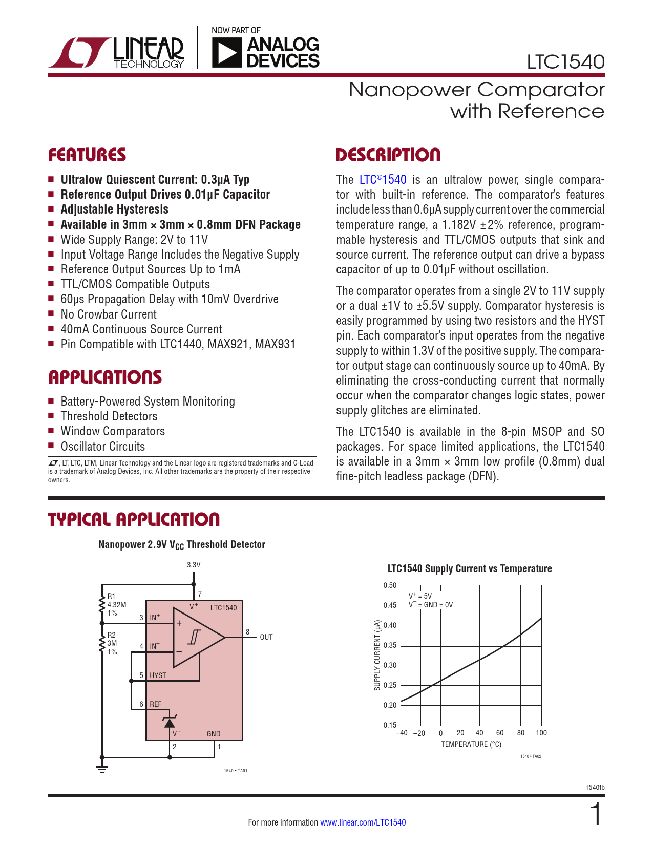 LTC1540 Nanopower Comparator with Reference FEATURESDESCRIPTION n Ultralow Quiescent Current: 0.3µA Typ The LTC®1540 is an ultralow power, single compara- n Reference Output Drives 0.01µF Capacitor tor with built-in reference. The comparator’s features n Adjustable Hysteresis include less than 0.6µA supply current over the commercial n Available in 3mm × 3mm × 0.8mm DFN Package temperature range, a 1.182V ±2% reference, program- n Wide Supply Range: 2V to 11V mable hysteresis and TTL/CMOS outputs that sink and n Input Voltage Range Includes the Negative Supply source current. The reference output can drive a bypass n Reference Output Sources Up to 1mA capacitor of up to 0.01µF without oscillation. n TTL/CMOS Compatible Outputs The comparator operates from a single 2V to 11V supply n 60µs Propagation Delay with 10mV Overdrive or a dual ±1V to ±5.5V supply. Comparator hysteresis is n No Crowbar Current easily programmed by using two resistors and the HYST n 40mA Continuous Source Current pin. Each comparator’s input operates from the negative n Pin Compatible with LTC1440, MAX921, MAX931 supply to within 1.3V of the positive supply. The compara- tor output stage can continuously source up to 40mA. By APPLICATIONS eliminating the cross-conducting current that normally occur when the comparator changes logic states, power n Battery-Powered System Monitoring supply glitches are eliminated. n Threshold Detectors n Window Comparators The LTC1540 is available in the 8-pin MSOP and SO n Oscillator Circuits packages. For space limited applications, the LTC1540 L, LT, LTC, LTM, Linear Technology and the Linear logo are registered trademarks and C-Load is available in a 3mm × 3mm low profile (0.8mm) dual is a trademark of Analog Devices, Inc. All other trademarks are the property of their respective owners. fine-pitch leadless package (DFN). TYPICAL APPLICATIONNanopower 2.9V VCC Threshold Detector 3.3V LTC1540 Supply Current vs Temperature 0.50 R1 7 V+ = 5V 4.32M V+ LTC1540 0.45 V– = GND = 0V 1% 3 IN+ + 0.40 R2 8 OUT 3M 4 IN– 0.35 1% – 0.30 5 HYST 0.25 SUPPLY CURRENT (µA) 6 REF 0.20 0.15 V– GND –40 –20 0 20 40 60 80 100 2 1 TEMPERATURE (°C) 1540 • TA02 1540 • TA01 1540fb For more information www.linear.com/LTC1540 1