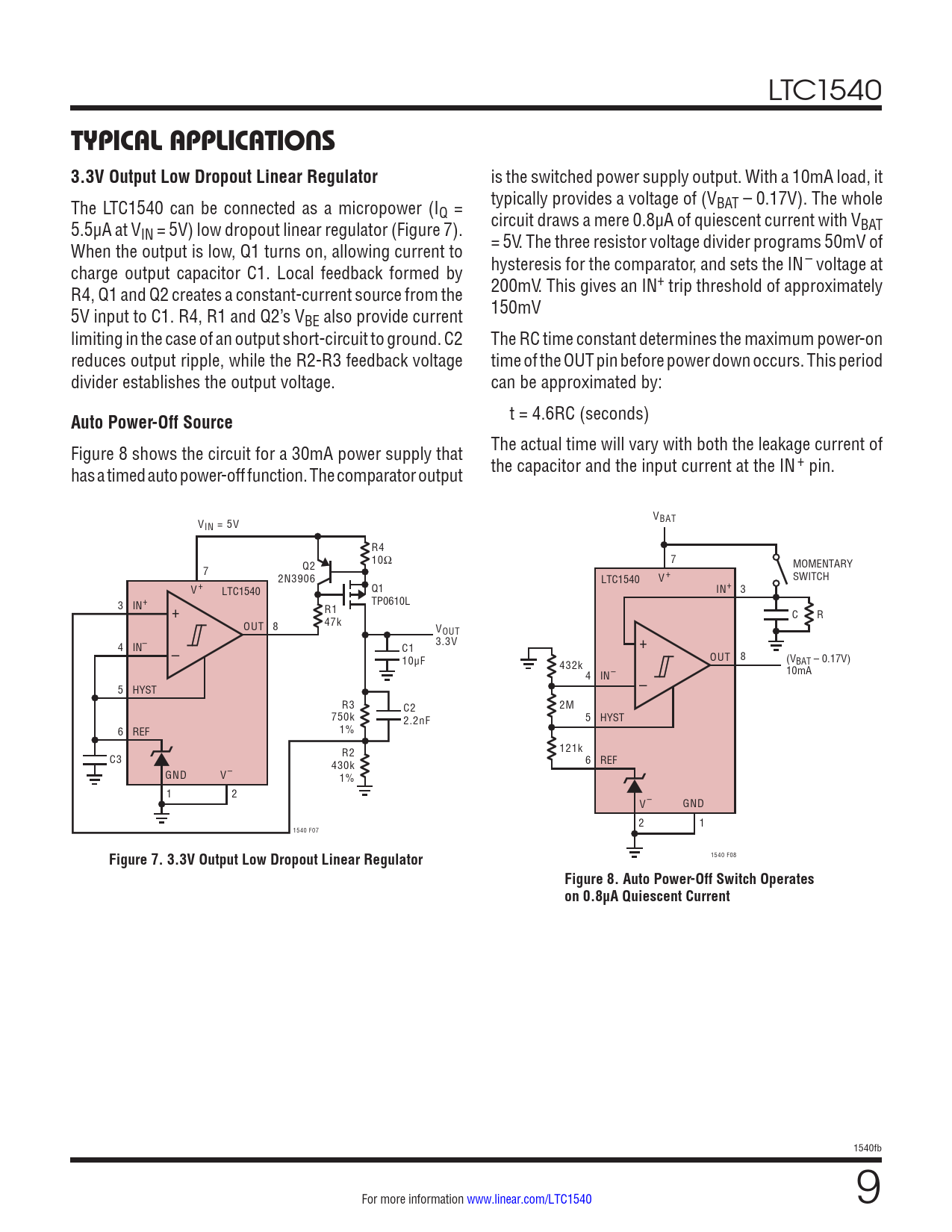 LTC1540 TYPICAL APPLICATIONS 3.3V Output Low Dropout Linear Regulator is the switched power supply output. With a 10mA load, it The LTC1540 can be connected as a micropower (I typically provides a voltage of (VBAT – 0.17V). The whole Q = 5.5µA at V circuit draws a mere 0.8µA of quiescent current with VBAT IN = 5V) low dropout linear regulator (Figure 7). When the output is low, Q1 turns on, allowing current to = 5V. The three resistor voltage divider programs 50mV of charge output capacitor C1. Local feedback formed by hysteresis for the comparator, and sets the IN– voltage at R4, Q1 and Q2 creates a constant-current source from the 200mV. This gives an IN+ trip threshold of approximately 5V input to C1. R4, R1 and Q2’s V 150mV BE also provide current limiting in the case of an output short-circuit to ground. C2 The RC time constant determines the maximum power-on reduces output ripple, while the R2-R3 feedback voltage time of the OUT pin before power down occurs. This period divider establishes the output voltage. can be approximated by: Auto Power-Off Source t = 4.6RC (seconds) Figure 8 shows the circuit for a 30mA power supply that The actual time will vary with both the leakage current of has a timed auto power-off function. The comparator output the capacitor and the input current at the IN+ pin. V V BAT IN = 5V R4 10Ω 7 MOMENTARY 7 Q2 2N3906 V+ SWITCH LTC1540 V+ Q1 LTC1540 IN+ 3 3 IN+ TP0610L R1 + C R OUT 8 47k VOUT 4 IN– 3.3V + – C1 10µF OUT 8 (V 432k BAT – 0.17V) 10mA 4 IN– 5 HYST – R3 C2 2M 750k 2.2nF 5 HYST 6 REF 1% 121k C3 R2 430k 6 REF GND V– 1% 1 2 V– GND 2 1 1540 F07 Figure 7. 3.3V Output Low Dropout Linear Regulator 1540 F08 Figure 8. Auto Power-Off Switch Operateson 0.8µA Quiescent Current 1540fb For more information www.linear.com/LTC1540 9