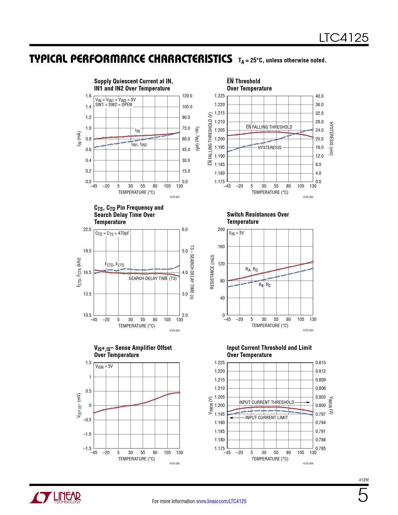22.5 6.0 200 CTD = CTS = 470pF VIN = 5V T3 – SEARCH DELA 160 19.5 5.0 120 (kHz) FCTD, FCTS RA, RD CTS 16.5 4.0 , F ANCE (mΩ) SEARCH DELAY TIME (T3) Y TIME (s) 80 F CTD R RESIST B, RC 13.5 3.0 40 10.5 2.0 0 –45 –20 5 30 55 80 105 130 –45 –20 5 30 55 80 105 130 TEMPERATURE (°C) TEMPERATURE (°C) 4125 G03 4125 G04