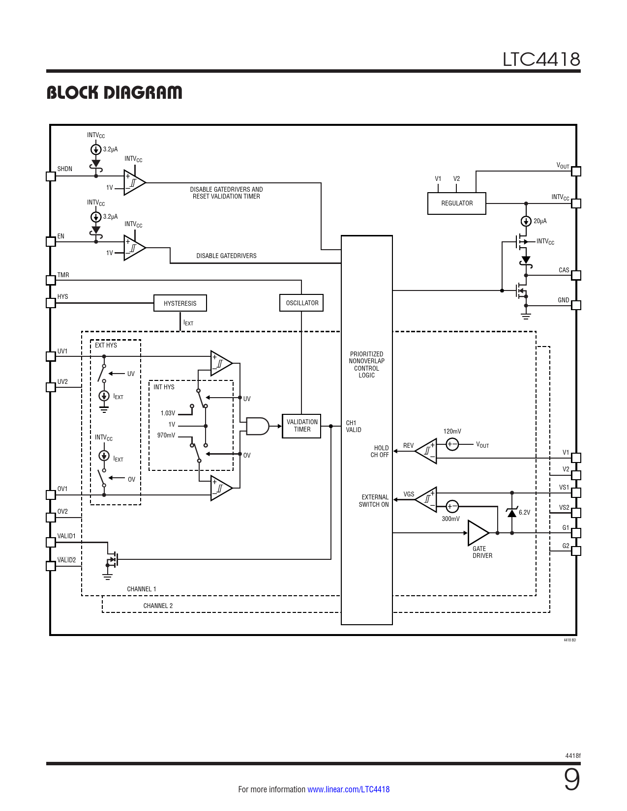 INTVCC 3.2µA INTVCC V SHDN OUT + V1 V2 1V – DISABLE GATEDRIVERS AND RESET VALIDATION TIMER INTVCC INTVCC REGULATOR 3.2µA 20µA INTVCC EN + INTVCC 1V – DISABLE GATEDRIVERS CAS TMR HYS GND HYSTERESIS OSCILLATOR IEXT EXT HYS UV1 PRIORITIZED + NONOVERLAP – CONTROL UV LOGIC UV2 INT HYS IEXT UV 1.03V VALIDATION CH1 1V TIMER VALID 120mV INTV 970mV CC + +– HOLD REV VOUT OV CH OFF V1 I – EXT V2 OV + OV1 VS1 – + EXTERNAL VGS SWITCH ON – +– OV2 VS2 6.2V 300mV G1 VALID1 GATE G2 DRIVER VALID2 CHANNEL 1 CHANNEL 2 4418 BD 4418f For more information www.linear.com/LTC4418 9 Document Outline Features Applications Description Typical Application Absolute Maximum Ratings Pin Configuration Order Information Electrical Characteristics Typical Performance Characteristics Pin Functions Block Diagram Timing Diagram Operation Applications Information Typical Applications Package Description Typical Application Related Parts