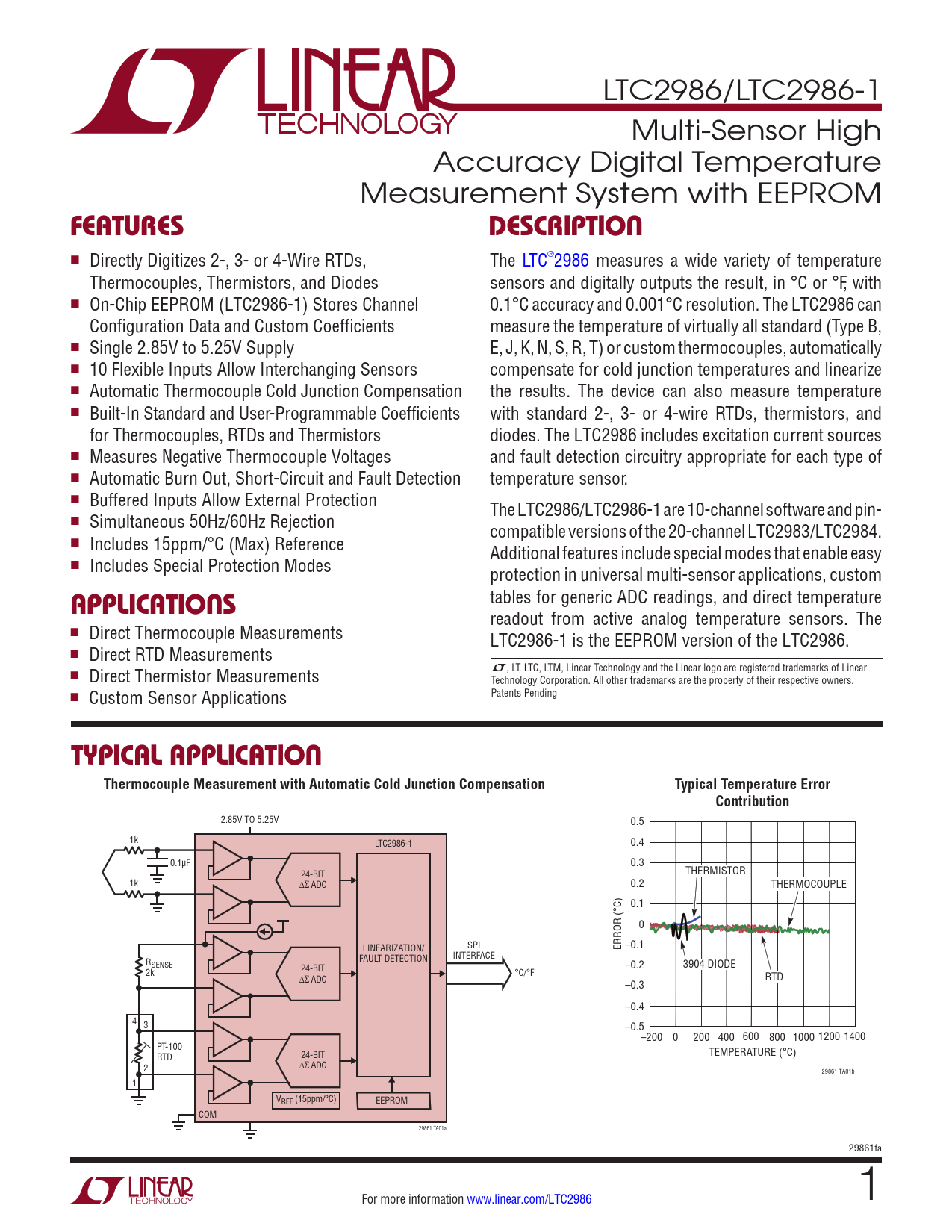LTC2986/LTC2986-1 Multi-Sensor High Accuracy Digital Temperature Measurement System with EEPROM FEATURESDESCRIPTION n Directly Digitizes 2-, 3- or 4-Wire RTDs, The LTC®2986 measures a wide variety of temperature Thermocouples, Thermistors, and Diodes sensors and digitally outputs the result, in °C or °F, with n On-Chip EEPROM (LTC2986-1) Stores Channel 0.1°C accuracy and 0.001°C resolution. The LTC2986 can Configuration Data and Custom Coefficients measure the temperature of virtually all standard (Type B, n Single 2.85V to 5.25V Supply E, J, K, N, S, R, T) or custom thermocouples, automatically n 10 Flexible Inputs Allow Interchanging Sensors compensate for cold junction temperatures and linearize n Automatic Thermocouple Cold Junction Compensation the results. The device can also measure temperature n Built-In Standard and User-Programmable Coefficients with standard 2-, 3- or 4-wire RTDs, thermistors, and for Thermocouples, RTDs and Thermistors diodes. The LTC2986 includes excitation current sources n Measures Negative Thermocouple Voltages and fault detection circuitry appropriate for each type of n Automatic Burn Out, Short-Circuit and Fault Detection temperature sensor. n Buffered Inputs Allow External Protection The LTC2986/LTC2986-1 are 10-channel software and pin- n Simultaneous 50Hz/60Hz Rejection compatible versions of the 20-channel LTC2983/LTC2984. n Includes 15ppm/°C (Max) Reference Additional features include special modes that enable easy n Includes Special Protection Modes protection in universal multi-sensor applications, custom tables for generic ADC readings, and direct temperature APPLICATIONS readout from active analog temperature sensors. The n Direct Thermocouple Measurements LTC2986-1 is the EEPROM version of the LTC2986. n Direct RTD Measurements L, LT, LTC, LTM, Linear Technology and the Linear logo are registered trademarks of Linear n Direct Thermistor Measurements Technology Corporation. All other trademarks are the property of their respective owners. Patents Pending n Custom Sensor Applications TYPICAL APPLICATIONThermocouple Measurement with Automatic Cold Junction CompensationTypical Temperature ErrorContribution 2.85V TO 5.25V 0.5 1k LTC2986-1 0.4 0.1µF 0.3 24-BIT THERMISTOR 1k ∆∑ ADC 0.2 THERMOCOUPLE 0.1 0 LINEARIZATION/ SPI ERROR (°C) –0.1 INTERFACE R FAULT DETECTION SENSE –0.2 3904 DIODE 24-BIT 2k °C/°F ∆∑ ADC RTD –0.3 –0.4 4 3 –0.5–200 0 200 400 600 800 1000 1200 1400 PT-100 RTD 24-BIT TEMPERATURE (°C) ∆∑ ADC 2 29861 TA01b 1 VREF (15ppm/°C) EEPROM COM 29861 TA01a 29861fa For more information www.linear.com/LTC2986 1 Document Outline Features Applications Typical Application Description Absolute Maximum Ratings Order Information Pin Configuration Complete System Electrical Characteristics ADC Electrical Characteristics Reference Electrical Characteristics Digital Inputs and Digital Outputs LTC2986-1 EEPROM Characteristics Typical Performance Characteristics Pin Functions Block Diagram Test Circuits Timing Diagram Overview Applications Information EEPROM Overview (LTC2986-1) EEPROM Read/Write Validation EEPROM Write Operation EEPROM Read Operation (LTC2986-1) Thermocouple Measurements Diode Measurements RTD Measurements Thermistor Measurements Global Configuration Register Input Overvoltage Protection – Overview Active Analog Temperature Sensors Direct ADC Measurements 2- and 3-Cycle Conversion Modes Running Conversions Consecutively on Multiple Channels Entering/Exiting Sleep Mode MUX Configuration Delay Reference Considerations Custom Thermocouples Custom RTDs Custom Thermistors Package Description Revision History Typical Application Related Parts