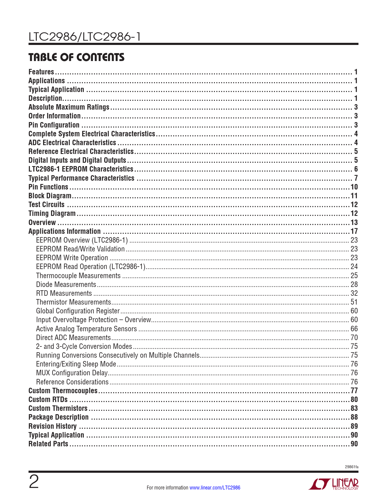 TABLE OF CONTENTS Features .. 1 Applications ... 1 Typical Application ... 1 Description... 1 Absolute Maximum Ratings ... 3 Order Information ... 3 Pin Configuration ... 3 Complete System Electrical Characteristics .. 4 ADC Electrical Characteristics .. 4 Reference Electrical Characteristics ... 5 Digital Inputs and Digital Outputs .. 5 LTC2986-1 EEPROM Characteristics ... 6 Typical Performance Characteristics .. 7 Pin Functions ...10 Block Diagram ..11 Test Circuits ..12 Timing Diagram ..12 Overview ..13 Applications Information ...17