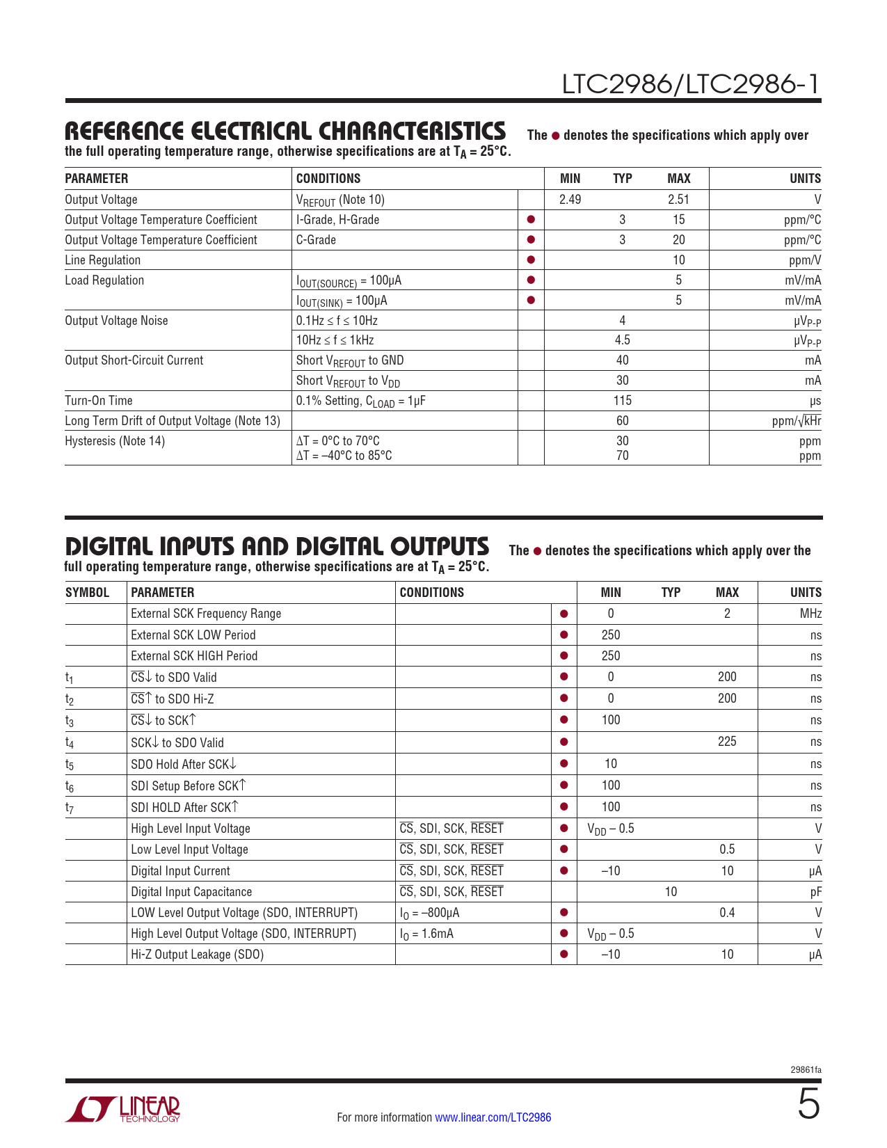 LTC2986/LTC2986-1 REFERENCE ELECTRICAL CHARACTERISTICSThe l denotes the specifications which apply overthe full operating temperature range, otherwise specifications are at TA = 25°C. PARAMETERCONDITIONSMINTYPMAXUNITS Output Voltage VREFOUT (Note 10) 2.49 2.51 V Output Voltage Temperature Coefficient I-Grade, H-Grade l 3 15 ppm/°C Output Voltage Temperature Coefficient C-Grade l 3 20 ppm/°C Line Regulation l 10 ppm/V Load Regulation IOUT(SOURCE) = 100µA l 5 mV/mA IOUT(SINK) = 100µA l 5 mV/mA Output Voltage Noise 0.1Hz ≤ f ≤ 10Hz 4 µVP-P 10Hz ≤ f ≤ 1kHz 4.5 µVP-P Output Short-Circuit Current Short VREFOUT to GND 40 mA Short VREFOUT to VDD 30 mA Turn-On Time 0.1% Setting, CLOAD = 1µF 115 µs Long Term Drift of Output Voltage (Note 13) 60 ppm/√kHr Hysteresis (Note 14) ∆T = 0°C to 70°C 30 ppm ∆T = –40°C to 85°C 70 ppm DIGITAL INPUTS AND DIGITAL OUTPUTSThe l denotes the specifications which apply over thefull operating temperature range, otherwise specifications are at TA = 25°C.SYMBOLPARAMETERCONDITIONSMINTYPMAXUNITS External SCK Frequency Range l 0 2 MHz External SCK LOW Period l 250 ns External SCK HIGH Period l 250 ns t1 CS↓ to SDO Valid l 0 200 ns t2 CS↑ to SDO Hi-Z l 0 200 ns t3 CS↓ to SCK↑ l 100 ns t4 SCK↓ to SDO Valid l 225 ns t5 SDO Hold After SCK↓ l 10 ns t6 SDI Setup Before SCK↑ l 100 ns t7 SDI HOLD After SCK↑ l 100 ns High Level Input Voltage CS, SDI, SCK, RESET l VDD – 0.5 V Low Level Input Voltage CS, SDI, SCK, RESET l 0.5 V Digital Input Current CS, SDI, SCK, RESET l –10 10 µA Digital Input Capacitance CS, SDI, SCK, RESET 10 pF LOW Level Output Voltage (SDO, INTERRUPT) IO = –800µA l 0.4 V High Level Output Voltage (SDO, INTERRUPT) IO = 1.6mA l VDD – 0.5 V Hi-Z Output Leakage (SDO) l –10 10 µA 29861fa For more information www.linear.com/LTC2986 5 Document Outline Features Applications Typical Application Description Absolute Maximum Ratings Order Information Pin Configuration Complete System Electrical Characteristics ADC Electrical Characteristics Reference Electrical Characteristics Digital Inputs and Digital Outputs LTC2986-1 EEPROM Characteristics Typical Performance Characteristics Pin Functions Block Diagram Test Circuits Timing Diagram Overview Applications Information EEPROM Overview (LTC2986-1) EEPROM Read/Write Validation EEPROM Write Operation EEPROM Read Operation (LTC2986-1) Thermocouple Measurements Diode Measurements RTD Measurements Thermistor Measurements Global Configuration Register Input Overvoltage Protection – Overview Active Analog Temperature Sensors Direct ADC Measurements 2- and 3-Cycle Conversion Modes Running Conversions Consecutively on Multiple Channels Entering/Exiting Sleep Mode MUX Configuration Delay Reference Considerations Custom Thermocouples Custom RTDs Custom Thermistors Package Description Revision History Typical Application Related Parts