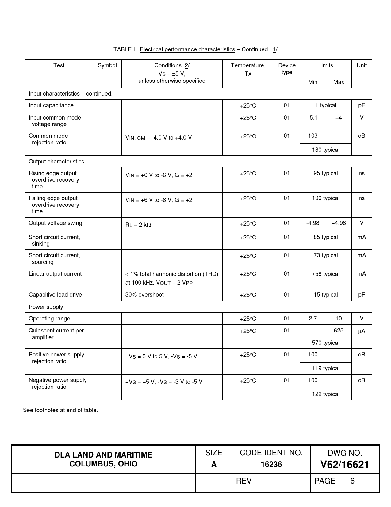 TABLE I. Electrical performance characteristics – Continued. 1/ Test Symbol Conditions 2/ Temperature, Device Limits Unit VS = 5 V, TA type unless otherwise specified Min Max Input characteristics – continued. Input capacitance +25C 01 1 typical pF Input common mode +25C 01 -5.1 +4 V voltage range Common mode VIN, CM = -4.0 V to +4.0 V +25C 01 103 dB rejection ratio 130 typical Output characteristics Rising edge output VIN = +6 V to -6 V, G = +2 +25C 01 95 typical ns overdrive recovery time Falling edge output VIN = +6 V to -6 V, G = +2 +25C 01 100 typical ns overdrive recovery time Output voltage swing RL = 2 k +25C 01 -4.98 +4.98 V Short circuit current, +25C 01 85 typical mA sinking Short circuit current, +25C 01 73 typical mA sourcing Linear output current 1% total harmonic distortion (THD) +25C 01 58 typical mA at 100 kHz, VOUT = 2 VPP Capacitive load drive 30% overshoot +25C 01 15 typical pF Power supply Operating range +25C 01 2.7 10 V Quiescent current per +25C 01 625 A amplifier 570 typical Positive power supply +VS = 3 V to 5 V, -VS = -5 V +25C 01 100 dB rejection ratio 119 typical Negative power supply +VS = +5 V, -VS = -3 V to -5 V +25C 01 100 dB rejection ratio 122 typical See footnotes at end of table. DLA LAND AND MARITIME SIZE CODE IDENT NO. DWG NO. COLUMBUS, OHIOA16236V62/16621 REV PAGE 6