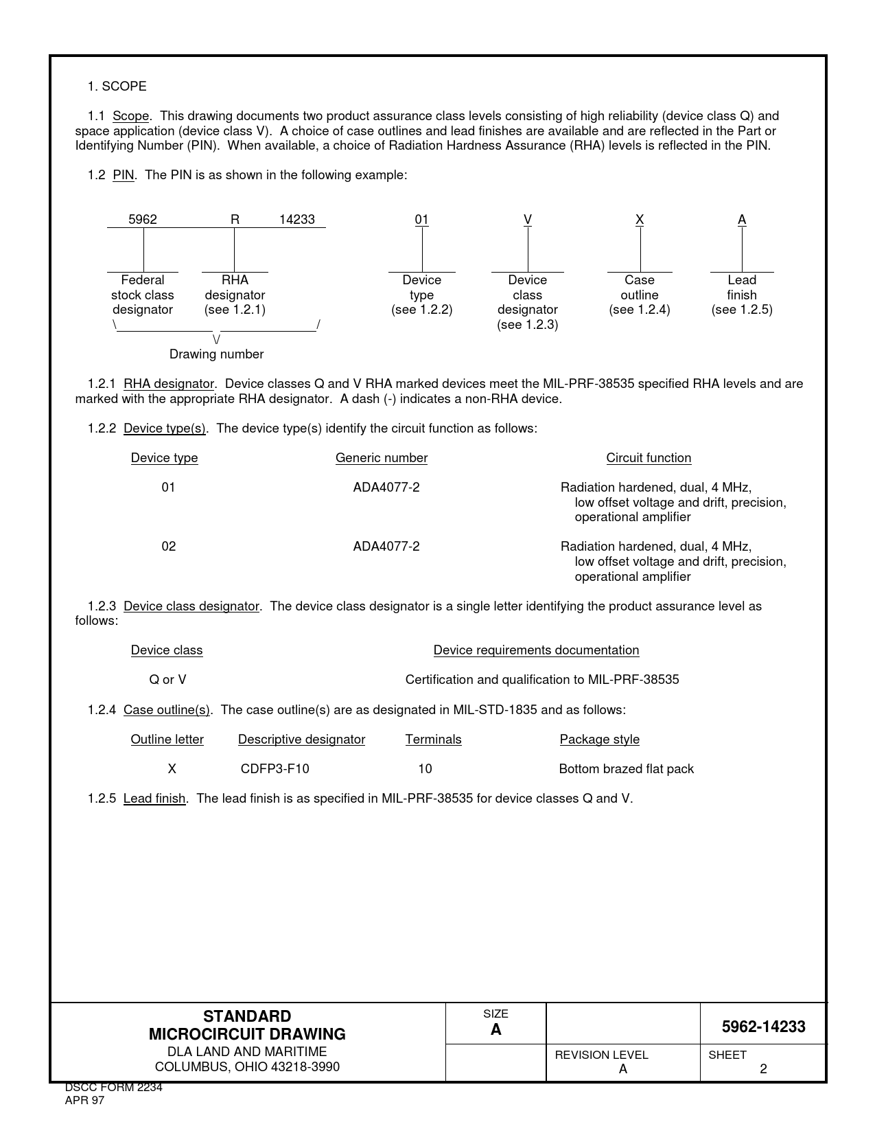 1. SCOPE 1.1 Scope. This drawing documents two product assurance class levels consisting of high reliability (device class Q) and space application (device class V). A choice of case outlines and lead finishes are available and are reflected in the Part or Identifying Number (PIN). When available, a choice of Radiation Hardness Assurance (RHA) levels is reflected in the PIN. 1.2 PIN. The PIN is as shown in the following example: 5962 R 14233 01 V X A Federal RHA Device Device Case Lead stock class designator type class outline finish designator (see 1.2.1) (see 1.2.2) designator (see 1.2.4) (see 1.2.5) \ / (see 1.2.3) \/ Drawing number 1.2.1 RHA designator. Device classes Q and V RHA marked devices meet the MIL-PRF-38535 specified RHA levels and are marked with the appropriate RHA designator. A dash (-) indicates a non-RHA device. 1.2.2 Device type(s). The device type(s) identify the circuit function as follows: Device type Generic number Circuit function 01 ADA4077-2 Radiation hardened, dual, 4 MHz, low offset voltage and drift, precision, operational amplifier 02 ADA4077-2 Radiation hardened, dual, 4 MHz, low offset voltage and drift, precision, operational amplifier 1.2.3 Device class designator. The device class designator is a single letter identifying the product assurance level as follows: Device class Device requirements documentation Q or V Certification and qualification to MIL-PRF-38535 1.2.4 Case outline(s). The case outline(s) are as designated in MIL-STD-1835 and as follows: Outline letter Descriptive designator Terminals Package style X CDFP3-F10 10 Bottom brazed flat pack 1.2.5 Lead finish. The lead finish is as specified in MIL-PRF-38535 for device classes Q and V.