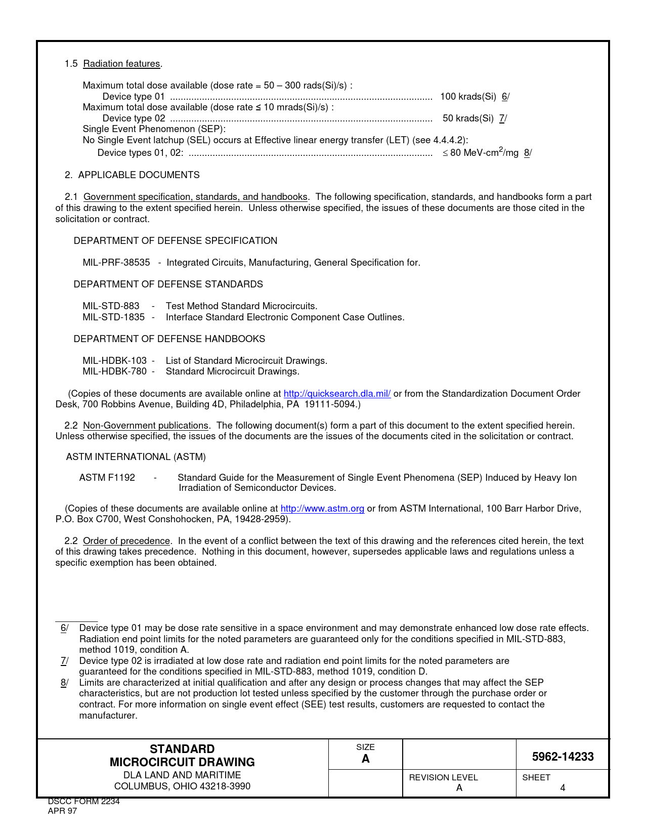 1.5 Radiation features. Maximum total dose available (dose rate = 50 – 300 rads(Si)/s) : Device type 01 ... 100 krads(Si) 6/ Maximum total dose available (dose rate ≤ 10 mrads(Si)/s) : Device type 02 ... 50 krads(Si) 7/ Single Event Phenomenon (SEP): No Single Event latchup (SEL) occurs at Effective linear energy transfer (LET) (see 4.4.4.2): Device types 01, 02: .. ≤ 80 MeV-cm2/mg 8/ 2. APPLICABLE DOCUMENTS 2.1 Government specification, standards, and handbooks. The following specification, standards, and handbooks form a part of this drawing to the extent specified herein. Unless otherwise specified, the issues of these documents are those cited in the solicitation or contract. DEPARTMENT OF DEFENSE SPECIFICATION MIL-PRF-38535 - Integrated Circuits, Manufacturing, General Specification for. DEPARTMENT OF DEFENSE STANDARDS MIL-STD-883 - Test Method Standard Microcircuits. MIL-STD-1835 - Interface Standard Electronic Component Case Outlines. DEPARTMENT OF DEFENSE HANDBOOKS MIL-HDBK-103 - List of Standard Microcircuit Drawings. MIL-HDBK-780 - Standard Microcircuit Drawings. (Copies of these documents are available online at http://quicksearch.dla.mil/ or from the Standardization Document Order Desk, 700 Robbins Avenue, Building 4D, Philadelphia, PA 19111-5094.) 2.2 Non-Government publications. The following document(s) form a part of this document to the extent specified herein. Unless otherwise specified, the issues of the documents are the issues of the documents cited in the solicitation or contract. ASTM INTERNATIONAL (ASTM) ASTM F1192 - Standard Guide for the Measurement of Single Event Phenomena (SEP) Induced by Heavy Ion Irradiation of Semiconductor Devices. (Copies of these documents are available online at http://www.astm.org or from ASTM International, 100 Barr Harbor Drive, P.O. Box C700, West Conshohocken, PA, 19428-2959). 2.2 Order of precedence. In the event of a conflict between the text of this drawing and the references cited herein, the text of this drawing takes precedence. Nothing in this document, however, supersedes applicable laws and regulations unless a specific exemption has been obtained. ________ 6/ Device type 01 may be dose rate sensitive in a space environment and may demonstrate enhanced low dose rate effects. Radiation end point limits for the noted parameters are guaranteed only for the conditions specified in MIL-STD-883, method 1019, condition A. 7/ Device type 02 is irradiated at low dose rate and radiation end point limits for the noted parameters are guaranteed for the conditions specified in MIL-STD-883, method 1019, condition D. 8/ Limits are characterized at initial qualification and after any design or process changes that may affect the SEP characteristics, but are not production lot tested unless specified by the customer through the purchase order or contract. For more information on single event effect (SEE) test results, customers are requested to contact the manufacturer.
