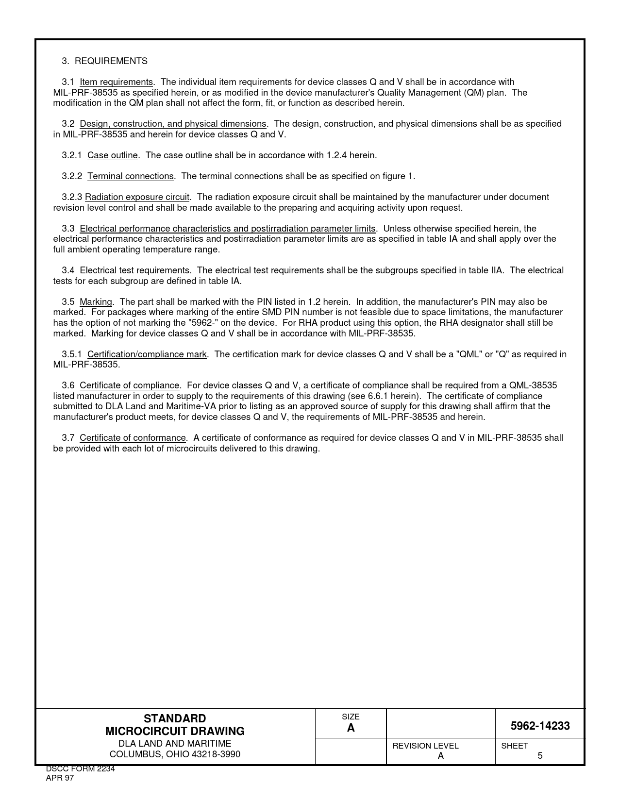 DLA LAND AND MARITIME REVISION LEVEL SHEET COLUMBUS, OHIO 43218-3990 A 5 DSCC FORM 2234 APR 97 Document Outline DEPARTMENT OF DEFENSE SPECIFICATION DEPARTMENT OF DEFENSE STANDARDS