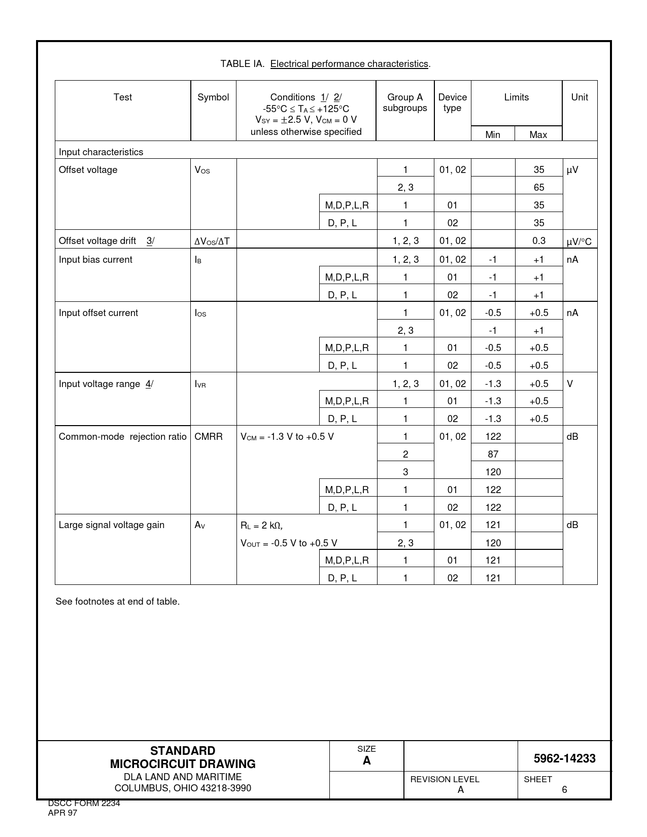 TABLE IA. Electrical performance characteristics. Test Symbol Conditions 1/ 2/ Group A Device Limits Unit -55°C ≤ TA ≤ +125°C subgroups type VSY = ±2.5 V, VCM = 0 V unless otherwise specified Min Max Input characteristics Offset voltage VOS 1 01, 02 35 µV 2, 3 65 M,D,P,L,R 1 01 35 D, P, L 1 02 35 Offset voltage drift 3/ ∆VOS/∆T 1, 2, 3 01, 02 0.3 µV/°C Input bias current IB 1, 2, 3 01, 02 -1 +1 nA M,D,P,L,R 1 01 -1 +1 D, P, L 1 02 -1 +1 Input offset current IOS 1 01, 02 -0.5 +0.5 nA 2, 3 -1 +1 M,D,P,L,R 1 01 -0.5 +0.5 D, P, L 1 02 -0.5 +0.5 Input voltage range 4/ IVR 1, 2, 3 01, 02 -1.3 +0.5 V M,D,P,L,R 1 01 -1.3 +0.5 D, P, L 1 02 -1.3 +0.5 Common-mode rejection ratio CMRR VCM = -1.3 V to +0.5 V 1 01, 02 122 dB 2 87 3 120 M,D,P,L,R 1 01 122 D, P, L 1 02 122 Large signal voltage gain AV RL = 2 kΩ, 1 01, 02 121 dB VOUT = -0.5 V to +0.5 V 2, 3 120 M,D,P,L,R 1 01 121 D, P, L 1 02 121 See footnotes at end of table. STANDARD SIZE 5962-14233MICROCIRCUIT DRAWINGA DLA LAND AND MARITIME REVISION LEVEL SHEET COLUMBUS, OHIO 43218-3990 A 6 DSCC FORM 2234 APR 97 Document Outline DEPARTMENT OF DEFENSE SPECIFICATION DEPARTMENT OF DEFENSE STANDARDS