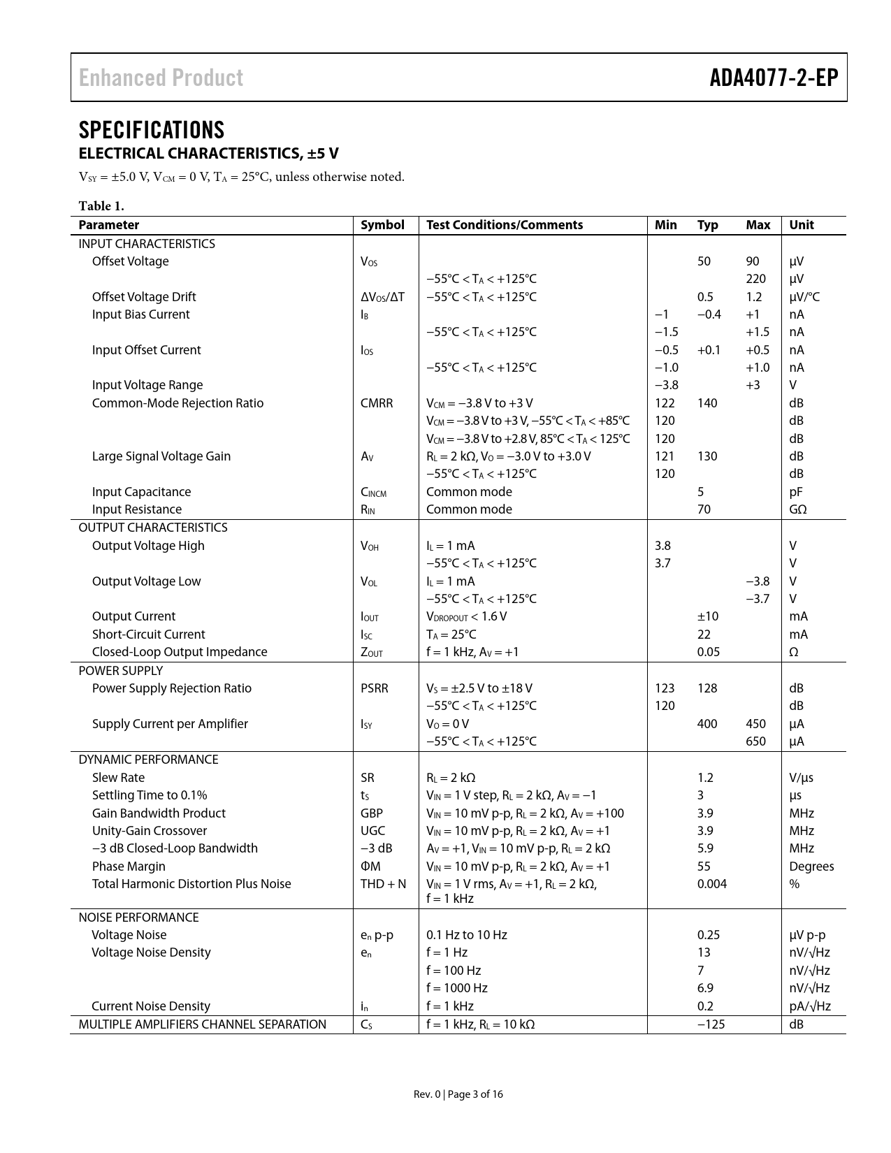 Enhanced Product. ADA4077-2-EP. SPECIFICATIONS ELECTRICAL CHARACTERISTICS, ±5 V. Table 1. Parameter. Symbol
