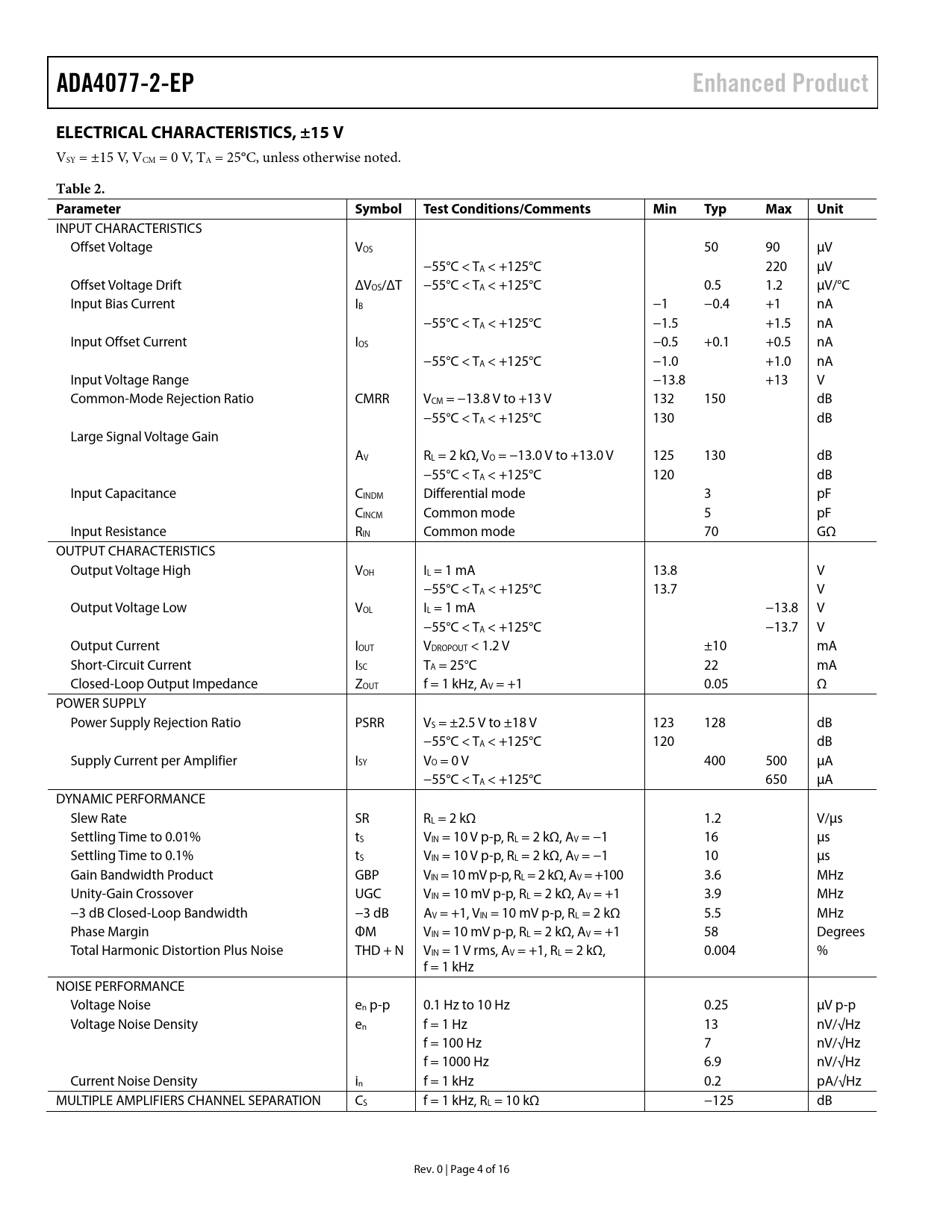 ADA4077-2-EP. Enhanced Product. ELECTRICAL CHARACTERISTICS, ±15 V. Table 2. Parameter. Symbol. Test Conditions/Comments. Min. Typ. Max
