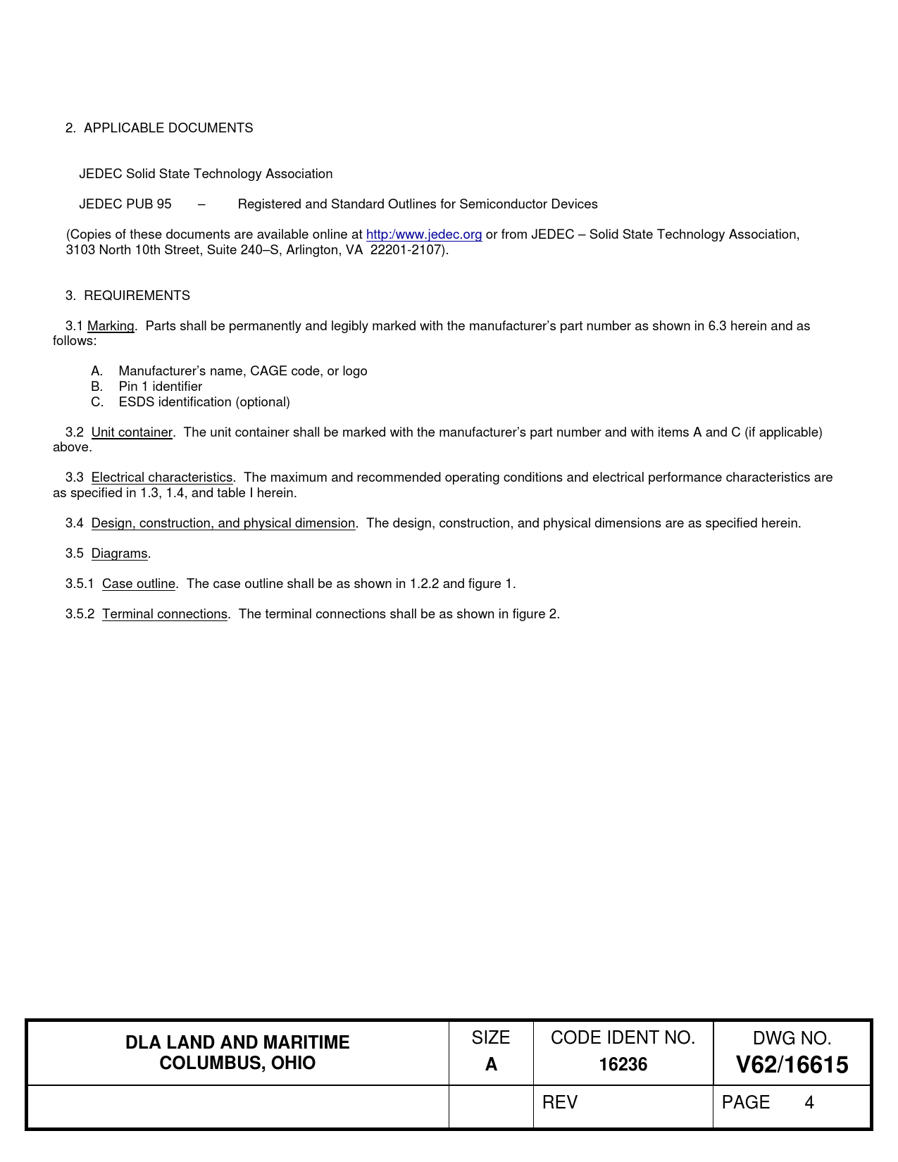 2. APPLICABLE DOCUMENTS JEDEC Solid State Technology Association JEDEC PUB 95 – Registered and Standard Outlines for Semiconductor Devices (Copies of these documents are available online at http:/www.jedec.org or from JEDEC – Solid State Technology Association, 3103 North 10th Street, Suite 240–S, Arlington, VA 22201-2107). 3. REQUIREMENTS 3.1 Marking. Parts shall be permanently and legibly marked with the manufacturer’s part number as shown in 6.3 herein and as follows: A. Manufacturer’s name, CAGE code, or logo B. Pin 1 identifier C. ESDS identification (optional) 3.2 Unit container. The unit container shall be marked with the manufacturer’s part number and with items A and C (if applicable) above. 3.3 Electrical characteristics. The maximum and recommended operating conditions and electrical performance characteristics are as specified in 1.3, 1.4, and table I herein. 3.4 Design, construction, and physical dimension. The design, construction, and physical dimensions are as specified herein. 3.5 Diagrams. 3.5.1 Case outline. The case outline shall be as shown in 1.2.2 and figure 1. 3.5.2 Terminal connections. The terminal connections shall be as shown in figure 2.