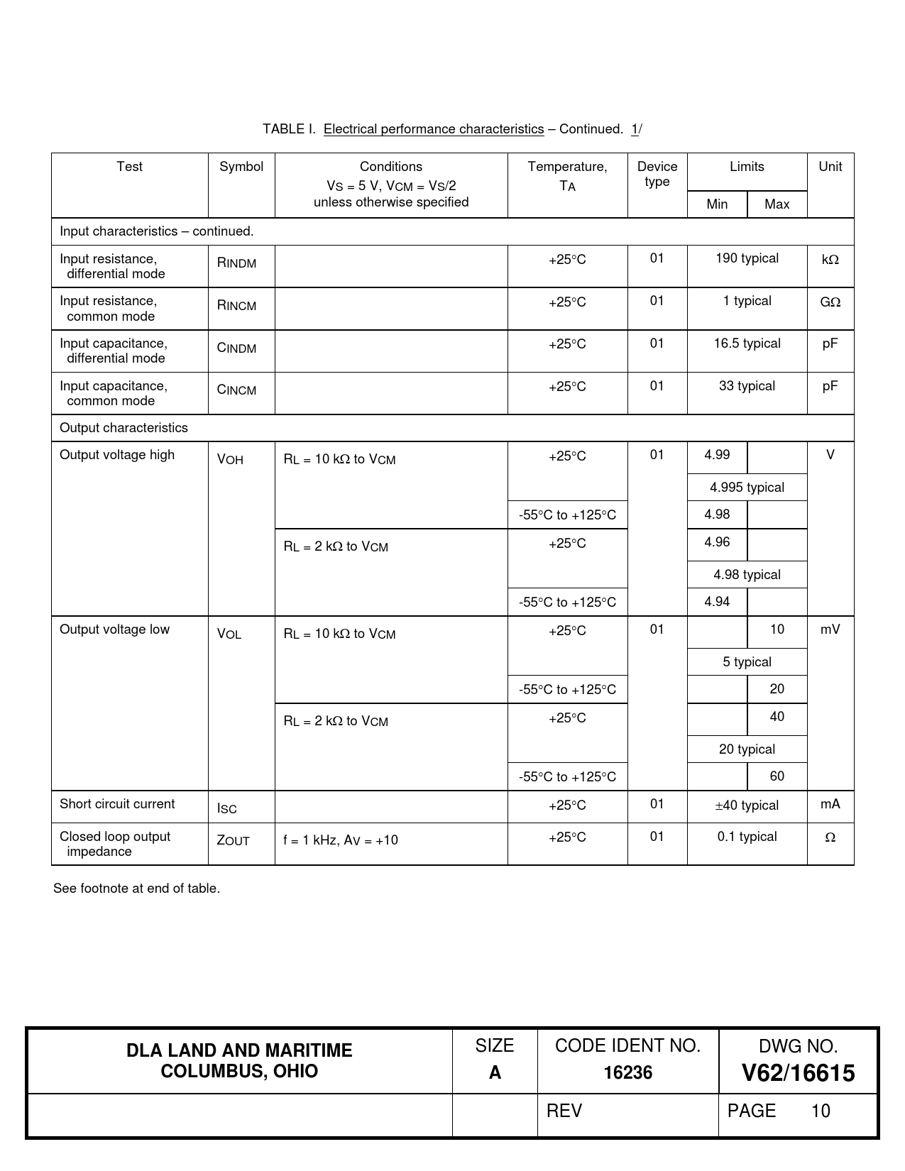 TABLE I. Electrical performance characteristics – Continued. 1/ Test Symbol Conditions Temperature, Device Limits Unit VS = 5 V, VCM = VS/2 TA type unless otherwise specified Min Max Input characteristics – continued. Input resistance, RINDM +25C 01 190 typical k differential mode Input resistance, RINCM +25C 01 1 typical G common mode Input capacitance, CINDM +25C 01 16.5 typical pF differential mode Input capacitance, CINCM +25C 01 33 typical pF common mode Output characteristics Output voltage high VOH RL = 10 k to VCM +25C 01 4.99 V 4.995 typical -55C to +125C 4.98 RL = 2 k to VCM +25C 4.96 4.98 typical -55C to +125C 4.94 Output voltage low VOL RL = 10 k to VCM +25C 01 10 mV 5 typical -55C to +125C 20 RL = 2 k to VCM +25C 40 20 typical -55C to +125C 60 Short circuit current ISC +25C 01 40 typical mA Closed loop output ZOUT f = 1 kHz, AV = +10 +25C 01 0.1 typical impedance See footnote at end of table.