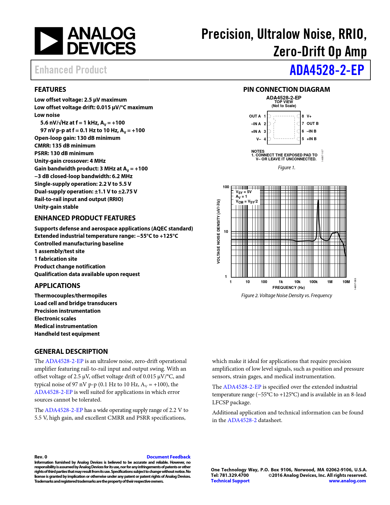 Precision, Ultralow Noise, RRIO,. Zero-Drift Op Amp. Enhanced Product. ADA4528-2-EP. FEATURES. PIN CONNECTION DIAGRAM