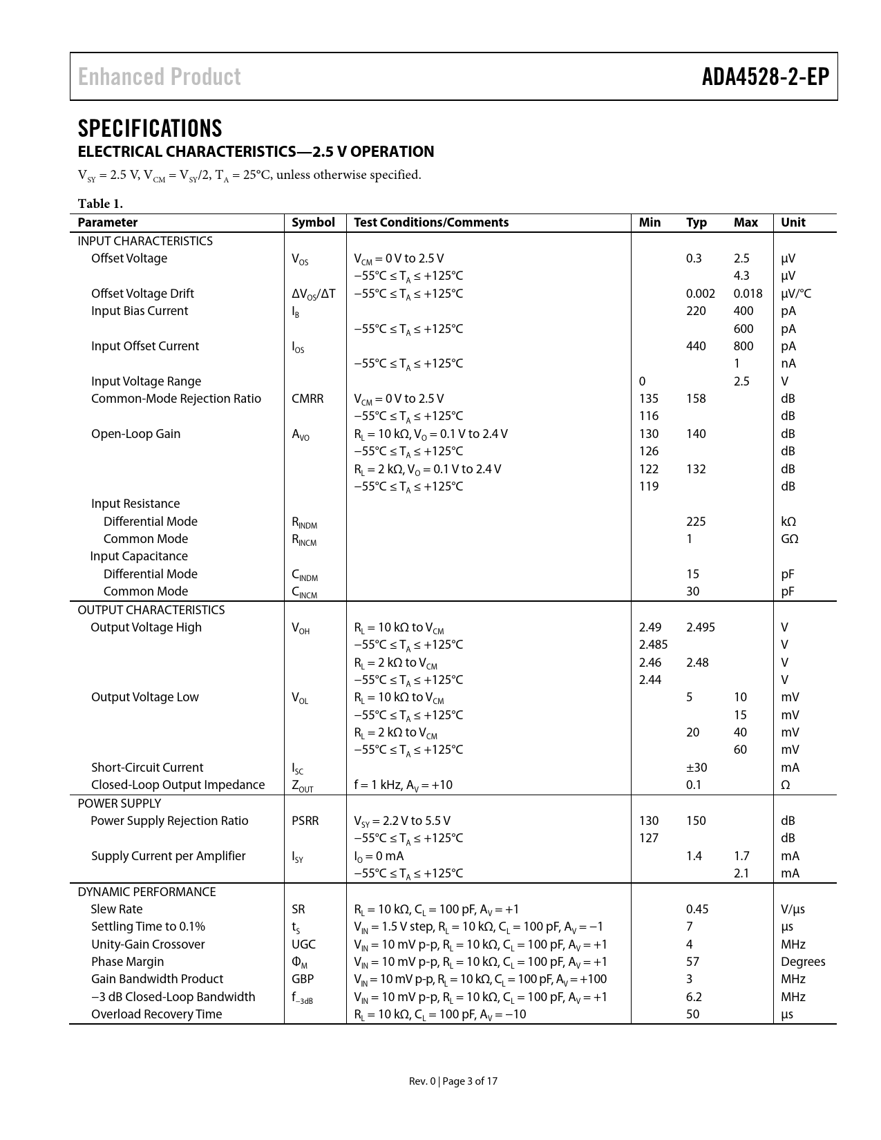 Enhanced ProductADA4528-2-EPSPECIFICATIONS ELECTRICAL CHARACTERISTICS—2.5 V OPERATION VSY = 2.5 V, VCM = VSY/2, TA = 25°C, unless otherwise specified. Table 1. ParameterSymbolTest Conditions/CommentsMinTypMaxUnit INPUT CHARACTERISTICS Offset Voltage V V = 0 V to 2.5 V 0.3 2.5 μV OS CM −55°C ≤ T ≤ +125°C 4.3 μV A Offset Voltage Drift ΔV /ΔT −55°C ≤ T ≤ +125°C 0.002 0.018 μV/°C OS A Input Bias Current I 220 400 pA B −55°C ≤ T ≤ +125°C 600 pA A Input Offset Current I 440 800 pA OS −55°C ≤ T ≤ +125°C 1 nA A Input Voltage Range 0 2.5 V Common-Mode Rejection Ratio CMRR V = 0 V to 2.5 V 135 158 dB CM −55°C ≤ T ≤ +125°C 116 dB A Open-Loop Gain A R = 10 kΩ, V = 0.1 V to 2.4 V 130 140 dB VO L O −55°C ≤ T ≤ +125°C 126 dB A R = 2 kΩ, V = 0.1 V to 2.4 V 122 132 dB L O −55°C ≤ T ≤ +125°C 119 dB A Input Resistance Differential Mode R 225 kΩ INDM Common Mode R 1 GΩ INCM Input Capacitance Differential Mode C 15 pF INDM Common Mode C 30 pF INCM OUTPUT CHARACTERISTICS Output Voltage High V R = 10 kΩ to V 2.49 2.495 V OH L CM −55°C ≤ T ≤ +125°C 2.485 V A R = 2 kΩ to V 2.46 2.48 V L CM −55°C ≤ T ≤ +125°C 2.44 V A Output Voltage Low V R = 10 kΩ to V 5 10 mV OL L CM −55°C ≤ T ≤ +125°C 15 mV A R = 2 kΩ to V 20 40 mV L CM −55°C ≤ T ≤ +125°C 60 mV A Short-Circuit Current I ±30 mA SC Closed-Loop Output Impedance Z f = 1 kHz, A = +10 0.1 Ω OUT V POWER SUPPLY Power Supply Rejection Ratio PSRR V = 2.2 V to 5.5 V 130 150 dB SY −55°C ≤ T ≤ +125°C 127 dB A Supply Current per Amplifier I I = 0 mA 1.4 1.7 mA SY O −55°C ≤ T ≤ +125°C 2.1 mA A DYNAMIC PERFORMANCE Slew Rate SR R = 10 kΩ, C = 100 pF, A = +1 0.45 V/μs L L V Settling Time to 0.1% t V = 1.5 V step, R = 10 kΩ, C = 100 pF, A = −1 7 µs S IN L L V Unity-Gain Crossover UGC V = 10 mV p-p, R = 10 kΩ, C = 100 pF, A = +1 4 MHz IN L L V Phase Margin Φ V = 10 mV p-p, R = 10 kΩ, C = 100 pF, A = +1 57 Degrees M IN L L V Gain Bandwidth Product GBP V = 10 mV p-p, R = 10 kΩ, C = 100 pF, A = +100 3 MHz IN L L V −3 dB Closed-Loop Bandwidth f V = 10 mV p-p, R = 10 kΩ, C = 100 pF, A = +1 6.2 MHz −3dB IN L L V Overload Recovery Time R = 10 kΩ, C = 100 pF, A = −10 50 μs L L V Rev. 0 | Page 3 of 17 Document Outline FEATURES ENHANCED PRODUCT FEATURES APPLICATIONS PIN CONNECTION DIAGRAM GENERAL DESCRIPTION TABLE OF CONTENTS REVISION HISTORY SPECIFICATIONS ELECTRICAL CHARACTERISTICS—2.5 V OPERATION ELECTRICAL CHARACTERISTICS—5 V OPERATION ABSOLUTE MAXIMUM RATINGS THERMAL RESISTANCE ESD CAUTION PIN CONFIGURATION AND FUNCTION DESCRIPTIONS TYPICAL PERFORMANCE CHARACTERISTICS OUTLINE DIMENSIONS ORDERING GUIDE