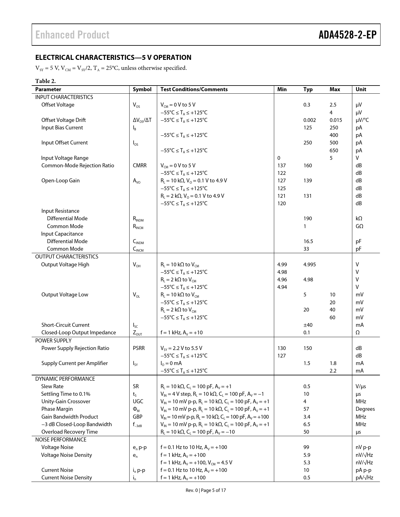 Enhanced ProductADA4528-2-EPELECTRICAL CHARACTERISTICS—5 V OPERATION VSY = 5 V, VCM = VSY/2, TA = 25°C, unless otherwise specified. Table 2. ParameterSymbolTest Conditions/CommentsMinTypMaxUnit INPUT CHARACTERISTICS Offset Voltage VOS VCM = 0 V to 5 V 0.3 2.5 μV −55°C ≤ TA ≤ +125°C 4 μV Offset Voltage Drift ΔVOS/ΔT −55°C ≤ TA ≤ +125°C 0.002 0.015 μV/°C Input Bias Current IB 125 250 pA −55°C ≤ TA ≤ +125°C 400 pA Input Offset Current IOS 250 500 pA −55°C ≤ TA ≤ +125°C 650 pA Input Voltage Range 0 5 V Common-Mode Rejection Ratio CMRR VCM = 0 V to 5 V 137 160 dB −55°C ≤ TA ≤ +125°C 122 dB Open-Loop Gain AVO RL = 10 kΩ, VO = 0.1 V to 4.9 V 127 139 dB −55°C ≤ TA ≤ +125°C 125 dB RL = 2 kΩ, VO = 0.1 V to 4.9 V 121 131 dB −55°C ≤ TA ≤ +125°C 120 dB Input Resistance Differential Mode RINDM 190 kΩ Common Mode RINCM 1 GΩ Input Capacitance Differential Mode CINDM 16.5 pF Common Mode CINCM 33 pF OUTPUT CHARACTERISTICS Output Voltage High VOH RL = 10 kΩ to VCM 4.99 4.995 V −55°C ≤ TA ≤ +125°C 4.98 V RL = 2 kΩ to VCM 4.96 4.98 V −55°C ≤ TA ≤ +125°C 4.94 V Output Voltage Low VOL RL = 10 kΩ to VCM 5 10 mV −55°C ≤ TA ≤ +125°C 20 mV RL = 2 kΩ to VCM 20 40 mV −55°C ≤ TA ≤ +125°C 60 mV Short-Circuit Current ISC ±40 mA Closed-Loop Output Impedance ZOUT f = 1 kHz, AV = +10 0.1 Ω POWER SUPPLY Power Supply Rejection Ratio PSRR VSY = 2.2 V to 5.5 V 130 150 dB −55°C ≤ TA ≤ +125°C 127 dB Supply Current per Amplifier ISY IO = 0 mA 1.5 1.8 mA −55°C ≤ TA ≤ +125°C 2.2 mA DYNAMIC PERFORMANCE Slew Rate SR RL = 10 kΩ, CL = 100 pF, AV = +1 0.5 V/μs Settling Time to 0.1% tS VIN = 4 V step, RL = 10 kΩ, CL = 100 pF, AV = −1 10 µs Unity-Gain Crossover UGC VIN = 10 mV p-p, RL = 10 kΩ, CL = 100 pF, AV = +1 4 MHz Phase Margin ΦM VIN = 10 mV p-p, RL = 10 kΩ, CL = 100 pF, AV = +1 57 Degrees Gain Bandwidth Product GBP VIN = 10 mV p-p, RL = 10 kΩ, CL = 100 pF, AV = +100 3.4 MHz −3 dB Closed-Loop Bandwidth f−3dB VIN = 10 mV p-p, RL = 10 kΩ, CL = 100 pF, AV = +1 6.5 MHz Overload Recovery Time RL = 10 kΩ, CL = 100 pF, AV = −10 50 μs NOISE PERFORMANCE Voltage Noise en p-p f = 0.1 Hz to 10 Hz, AV = +100 99 nV p-p Voltage Noise Density en f = 1 kHz, AV = +100 5.9 nV/√Hz f = 1 kHz, AV = +100, VCM = 4.5 V 5.3 nV/√Hz Current Noise in p-p f = 0.1 Hz to 10 Hz, AV = +100 10 pA p-p Current Noise Density in f = 1 kHz, AV = +100 0.5 pA/√Hz Rev. 0 | Page 5 of 17 Document Outline FEATURES ENHANCED PRODUCT FEATURES APPLICATIONS PIN CONNECTION DIAGRAM GENERAL DESCRIPTION TABLE OF CONTENTS REVISION HISTORY SPECIFICATIONS ELECTRICAL CHARACTERISTICS—2.5 V OPERATION ELECTRICAL CHARACTERISTICS—5 V OPERATION ABSOLUTE MAXIMUM RATINGS THERMAL RESISTANCE ESD CAUTION PIN CONFIGURATION AND FUNCTION DESCRIPTIONS TYPICAL PERFORMANCE CHARACTERISTICS OUTLINE DIMENSIONS ORDERING GUIDE