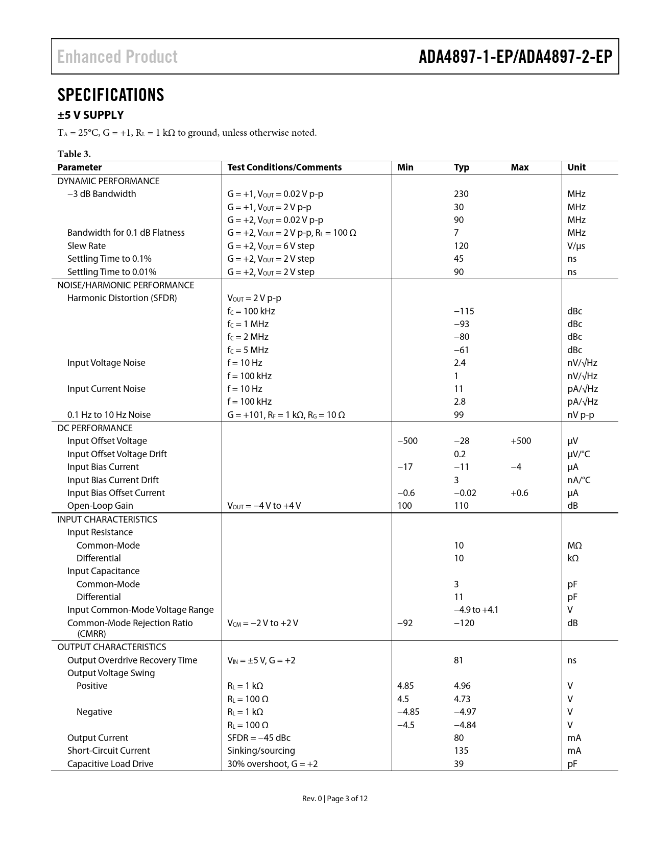 Enhanced Product. ADA4897-1-EP/ADA4897-2-EP. SPECIFICATIONS ±5 V SUPPLY. Table 3. Parameter. Test Conditions/Comments. Min. Typ. Max