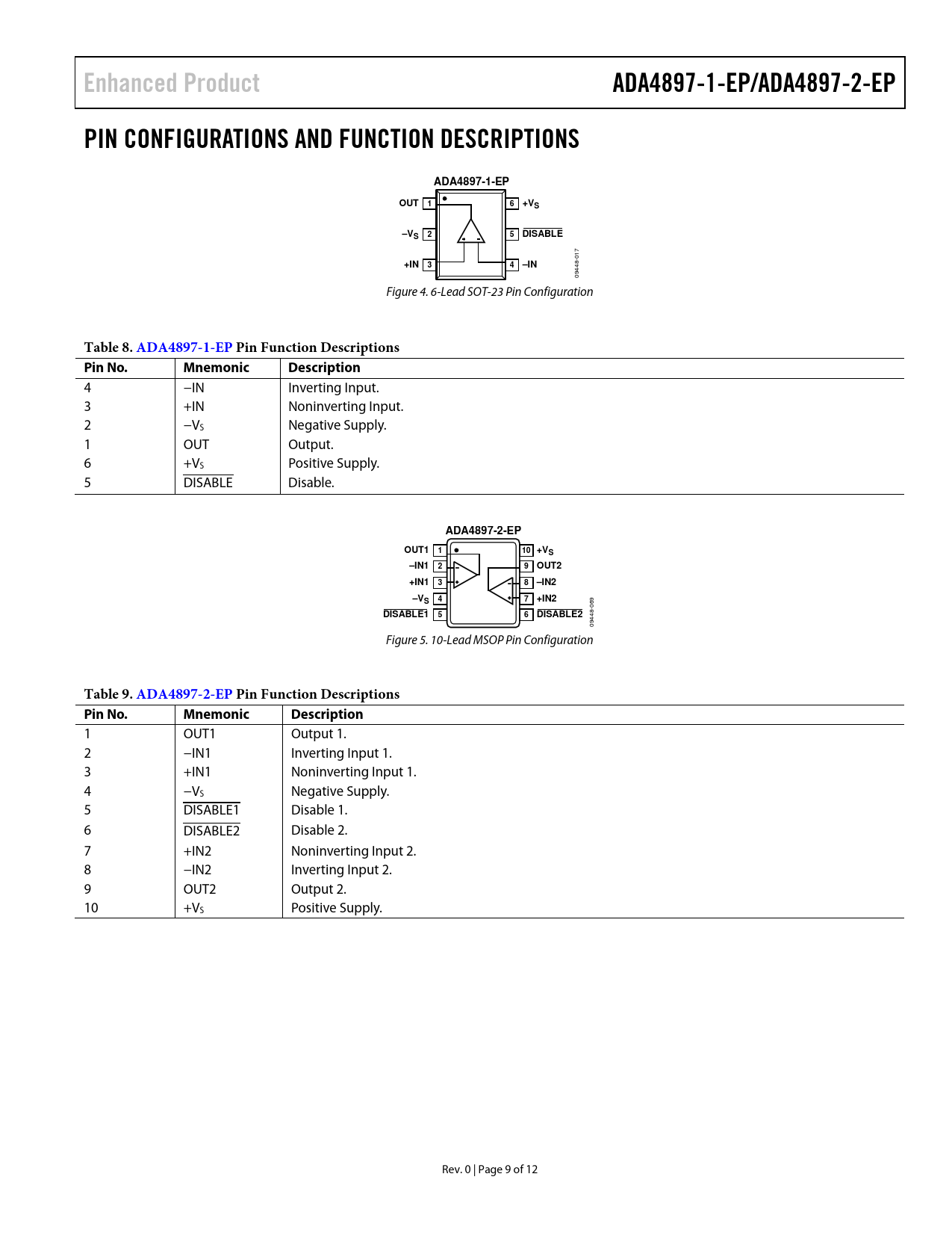 Enhanced Product ADA4897-1-EP/ADA4897-2-EP PIN CONFIGURATIONS AND FUNCTION DESCRIPTIONS ADA4897-1-EP OUT 1 6 +VS –VS 2 5 DISABLE