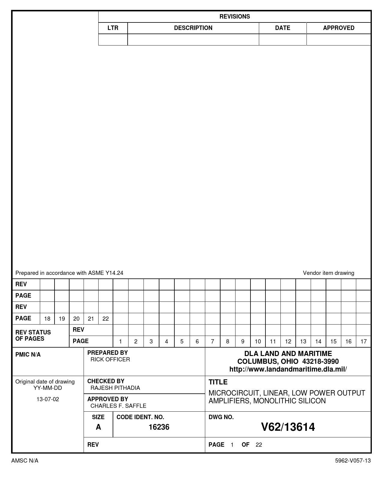 22 AMSC N/A 5962-V057-13 Document Outline DESCRIPTION REV REV PMIC N/A DLA LAND AND MARITIME TITLE SIZE A V62/13614 REV