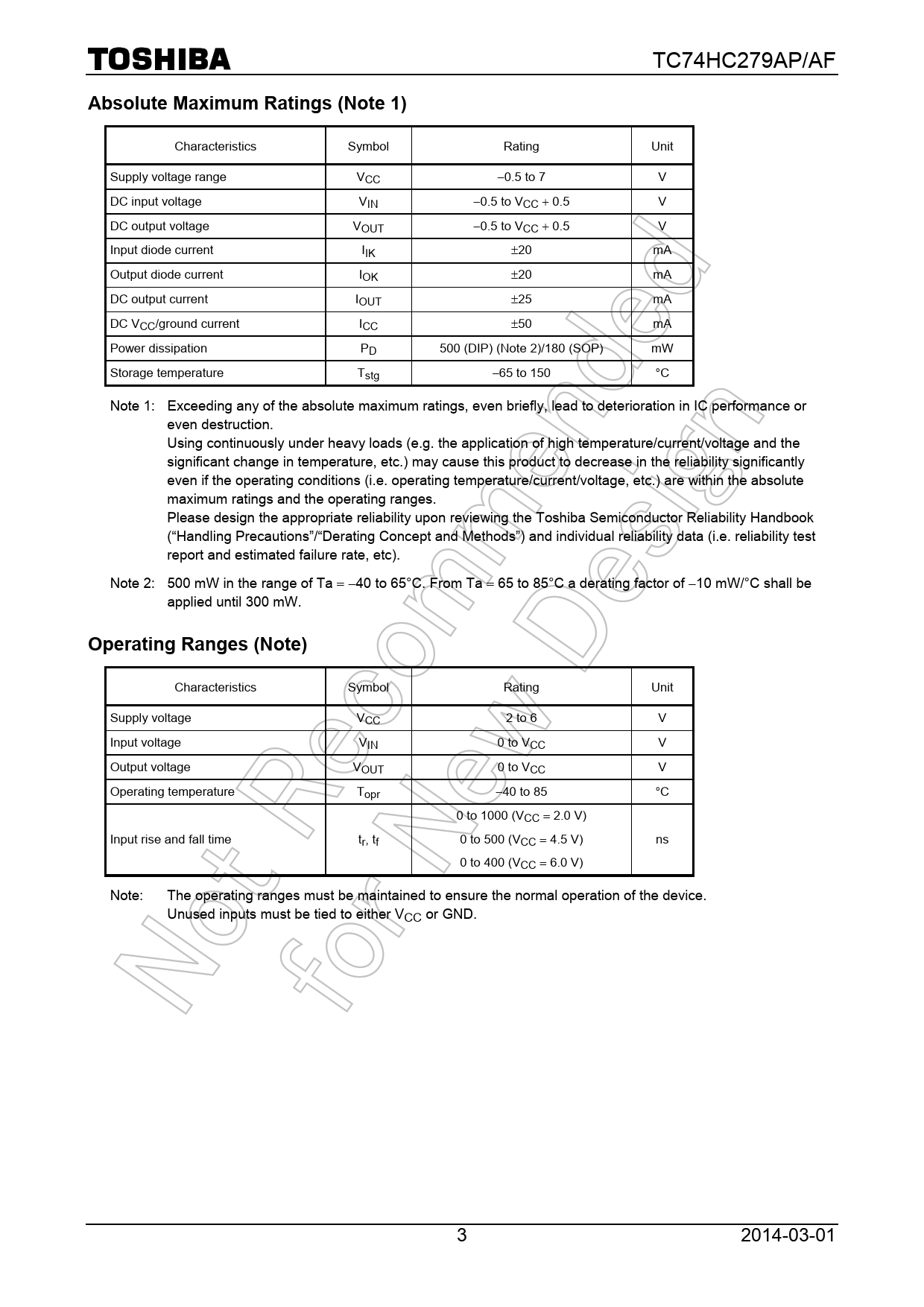 Characteristics Symbol Rating Unit Supply voltage range VCC −0.5 to 7 V DC input voltage VIN −0.5 to VCC + 0.5 V DC output voltage VOUT −0.5 to VCC + 0.5 V Input diode current IIK ±20 mA Output diode current IOK ±20 mA DC output current IOUT ±25 mA DC VCC/ground current ICC ±50 mA Power dissipation PD 500 (DIP) (Note 2)/180 (SOP) mW Storage temperature Tstg −65 to 150 °C Note 1: Exceeding any of the absolute maximum ratings, even briefly, lead to deterioration in IC performance or even destruction. Using continuously under heavy loads (e.g. the application of high temperature/current/voltage and the significant change in temperature, etc.) may cause this product to decrease in the reliability significantly even if the operating conditions (i.e. operating temperature/current/voltage, etc.) are within the absolute maximum ratings and the operating ranges. Please design the appropriate reliability upon reviewing the Toshiba Semiconductor Reliability Handbook (“Handling Precautions”/“Derating Concept and Methods”) and individual reliability data (i.e. reliability test report and estimated failure rate, etc). Note 2: 500 mW in the range of Ta = −40 to 65°C. From Ta = 65 to 85°C a derating factor of −10 mW/°C shall be applied until 300 mW.
