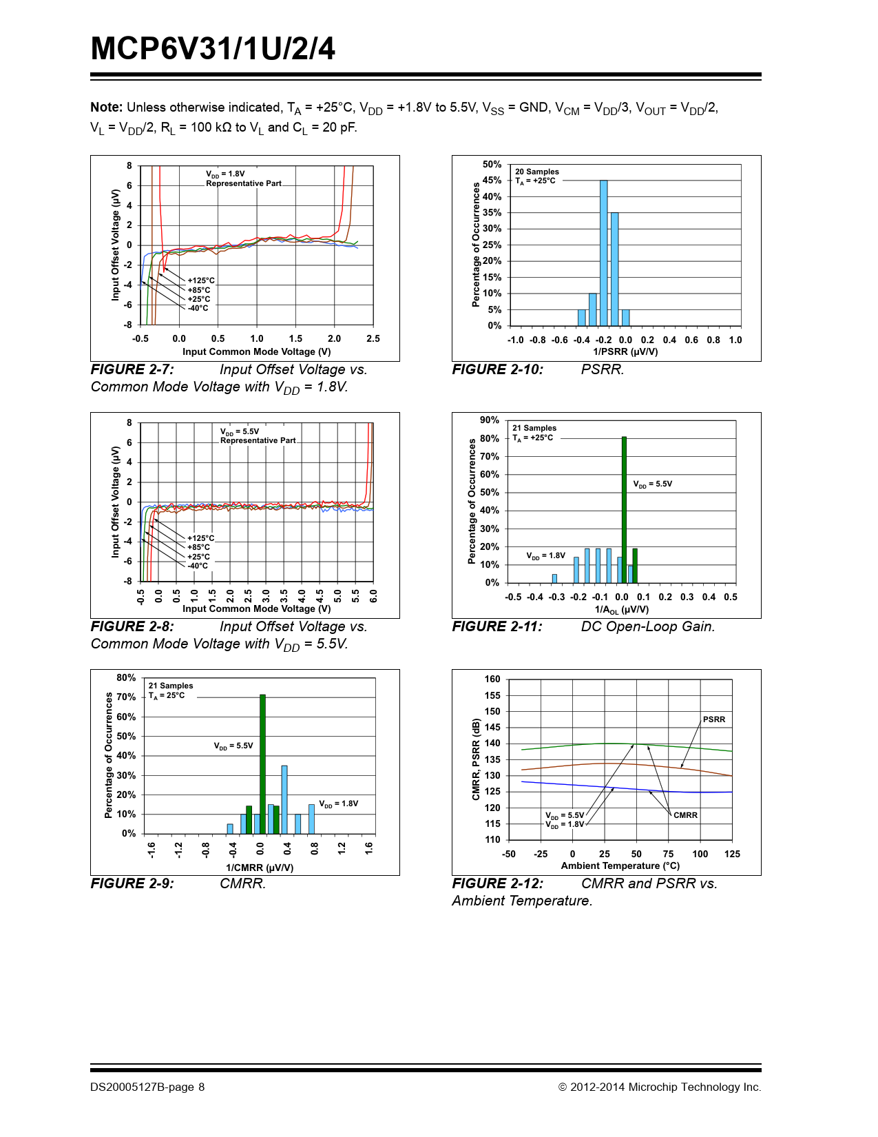 MCP6V31/1U/2/4Note: Unless otherwise indicated, TA = +25°C, VDD = +1.8V to 5.5V, VSS = GND, VCM = VDD/3, VOUT = VDD/2, VL = VDD/2, RL = 100 kΩ to VL and CL = 20 pF. 850%V= 1.8V20 SamplesDD45%T = +25°C6Representative Part6sAs40%(µV) 4errence 35%230%oltag VOccu025%ffset -220%ge ofOa 15%-4+125°C +85°Crcent 10%Input+25°Ce-6P-40°C5%-80%-0.50.00.51.01.52.02.5-1.0 -0.8 -0.6 -0.4 -0.2 0.0 0.2 0.4 0.6 0.8 1.0Input Common Mode Voltage (V)1/PSRR (µV/V)FIGURE 2-7: Input Offset Voltage vs. FIGURE 2-10: PSRR. Common Mode Voltage with VDD = 1.8V. 890%V= 5.5V21 SamplesDDT = +25°C6Representative Part680%sAs70%(µV) 4errence 60%2V= 5.5VDDoltag50%VOccu040%ffset -2ge ofOa 30%-4+125°C +85°C20%rcentInput+25°CeV= 1.8V-6DDP-40°C10%-80%-0.5 -0.4 -0.3 -0.2 -0.1 0.0 0.1 0.2 0.3 0.4 0.5-0.50.00.51.01.52.02.53.03.54.04.55.05.56.0Input Common Mode Voltage (V)1/A(µV/V)OLFIGURE 2-8: Input Offset Voltage vs. FIGURE 2-11: DC Open-Loop Gain. Common Mode Voltage with VDD = 5.5V. 80%16021 Samples70%T = 25°C155A15060%PSRRB) 14550%V= 5.5V140DDRR (d40%S 13530%130tage of OccurrencesRR, P20%125CMV= 1.8VDD120Percen 10%V= 5.5V5VCMRRDD115V= 1.8VDD0%110-1.6-1.2-0.8-0.40.00.40.81.21.6-50-2502550751001251/CMRR (µV/V)Ambient Temperature (°C)FIGURE 2-9: CMRR. FIGURE 2-12: CMRR and PSRR vs. Ambient Temperature. DS20005127B-page 8 2012-2014 Microchip Technology Inc. Document Outline 1.0 Electrical Characteristics 1.1 Absolute Maximum Ratings † 1.2 Specifications TABLE 1-1: DC Electrical Specifications TABLE 1-2: AC Electrical Specifications TABLE 1-3: Temperature Specifications 1.3 Timing Diagrams FIGURE 1-1: Amplifier Start Up. FIGURE 1-2: Offset Correction Settling Time. FIGURE 1-3: Output Overdrive Recovery. 1.4 Test Circuits FIGURE 1-4: AC and DC Test Circuit for Most Non-Inverting Gain Conditions. FIGURE 1-5: AC and DC Test Circuit for Most Inverting Gain Conditions. FIGURE 1-6: Test Circuit for Dynamic Input Behavior. 2.0 Typical Performance Curves 2.1 DC Input Precision FIGURE 2-1: Input Offset Voltage. FIGURE 2-2: Input Offset Voltage Drift. FIGURE 2-3: Input Offset Voltage Quadratic Temp. Co. FIGURE 2-4: Input Offset Voltage vs. Power Supply Voltage with VCM = VCML. FIGURE 2-5: Input Offset Voltage vs. Power Supply Voltage with VCM = VCMH. FIGURE 2-6: Input Offset Voltage vs. Output Voltage. FIGURE 2-7: Input Offset Voltage vs. Common Mode Voltage with VDD = 1.8V. FIGURE 2-8: Input Offset Voltage vs. Common Mode Voltage with VDD = 5.5V. FIGURE 2-9: CMRR. FIGURE 2-10: PSRR. FIGURE 2-11: DC Open-Loop Gain. FIGURE 2-12: CMRR and PSRR vs. Ambient Temperature. FIGURE 2-13: DC Open-Loop Gain vs. Ambient Temperature. FIGURE 2-14: Input Bias and Offset Currents vs. Common Mode Input Voltage with TA = +85°C. FIGURE 2-15: Input Bias and Offset Currents vs. Common Mode Input Voltage with TA = +125°C. FIGURE 2-16: Input Bias and Offset Currents vs. Ambient Temperature with VDD = +5.5V. FIGURE 2-17: Input Bias Current vs. Input Voltage (below VSS). 2.2 Other DC Voltages and Currents FIGURE 2-18: Input Common Mode Voltage Headroom (Range) vs. Ambient Temperature. FIGURE 2-19: Output Voltage Headroom vs. Output Current. FIGURE 2-20: Output Voltage Headroom vs. Ambient Temperature. FIGURE 2-21: Output Short Circuit Current vs. Power Supply Voltage. FIGURE 2-22: Supply Current vs. Power Supply Voltage. FIGURE 2-23: Power-on Reset Trip Voltage. FIGURE 2-24: Power-on Reset Voltage vs. Ambient Temperature. 2.3 Frequency Response FIGURE 2-25: CMRR and PSRR vs. Frequency. FIGURE 2-26: Open-Loop Gain vs. Frequency with VDD = 1.8V. FIGURE 2-27: Open-Loop Gain vs. Frequency with VDD = 5.5V. FIGURE 2-28: Gain Bandwidth Product and Phase Margin vs. Ambient Temperature. FIGURE 2-29: Gain Bandwidth Product and Phase Margin vs. Common Mode Input Voltage. FIGURE 2-30: Gain Bandwidth Product and Phase Margin vs. Output Voltage. FIGURE 2-31: Closed-Loop Output Impedance vs. Frequency with VDD = 1.8V. FIGURE 2-32: Closed-Loop Output Impedance vs. Frequency with VDD = 5.5V. FIGURE 2-33: Channel-to-Channel Separation vs. Frequency. FIGURE 2-34: Maximum Output Voltage Swing vs. Frequency. 2.4 Input Noise and Distortion FIGURE 2-35: Input Noise Voltage Density and Integrated Input Noise Voltage vs. Frequency. FIGURE 2-36: Input Noise Voltage Density vs. Input Common Mode Voltage. FIGURE 2-37: Inter-Modulation Distortion vs. Frequency with VCM Disturbance (see Figure 1-6). FIGURE 2-38: Inter-Modulation Distortion vs. Frequency with VDD Disturbance (see Figure 1-6). FIGURE 2-39: Input Noise vs. Time with 1 Hz and 10 Hz Filters and VDD = 1.8V. FIGURE 2-40: Input Noise vs. Time with 1 Hz and 10 Hz Filters and VDD = 5.5V. 2.5 Time Response FIGURE 2-41: Input Offset Voltage vs. Time with Temperature Change. FIGURE 2-42: Input Offset Voltage vs. Time at Power Up. FIGURE 2-43: The MCP6V31/1U/2/4 Family Shows No Input Phase Reversal with Overdrive. FIGURE 2-44: Non-inverting Small Signal Step Response. FIGURE 2-45: Non-inverting Large Signal Step Response. FIGURE 2-46: Inverting Small Signal Step Response. FIGURE 2-47: Inverting Large Signal Step Response. FIGURE 2-48: Slew Rate vs. Ambient Temperature. FIGURE 2-49: Output Overdrive Recovery vs. Time with G = -10 V/V. FIGURE 2-50: Output Overdrive Recovery Time vs. Inverting Gain. 3.0 Pin Descriptions TABLE 3-1: Pin Function Table 3.1 Analog Outputs 3.2 Analog Inputs 3.3 Power Supply Pins 3.4 Exposed Thermal Pad (EP) 4.0 Applications 4.1 Overview of Zero-Drift Operation FIGURE 4-1: Simplified Zero-Drift Op Amp Functional Diagram. FIGURE 4-2: First Chopping Clock Phase; Equivalent Amplifier Diagram. FIGURE 4-3: Second Chopping Clock Phase; Equivalent Amplifier Diagram. 4.2 Other Functional Blocks FIGURE 4-4: Simplified Analog Input ESD Structures. FIGURE 4-5: Protecting the Analog Inputs Against High Voltages. FIGURE 4-6: Protecting the Analog Inputs Against High Currents. 4.3 Application Tips FIGURE 4-7: Output Resistor, RISO, Stabilizes Capacitive Loads. FIGURE 4-8: Recommended RISO values for Capacitiv