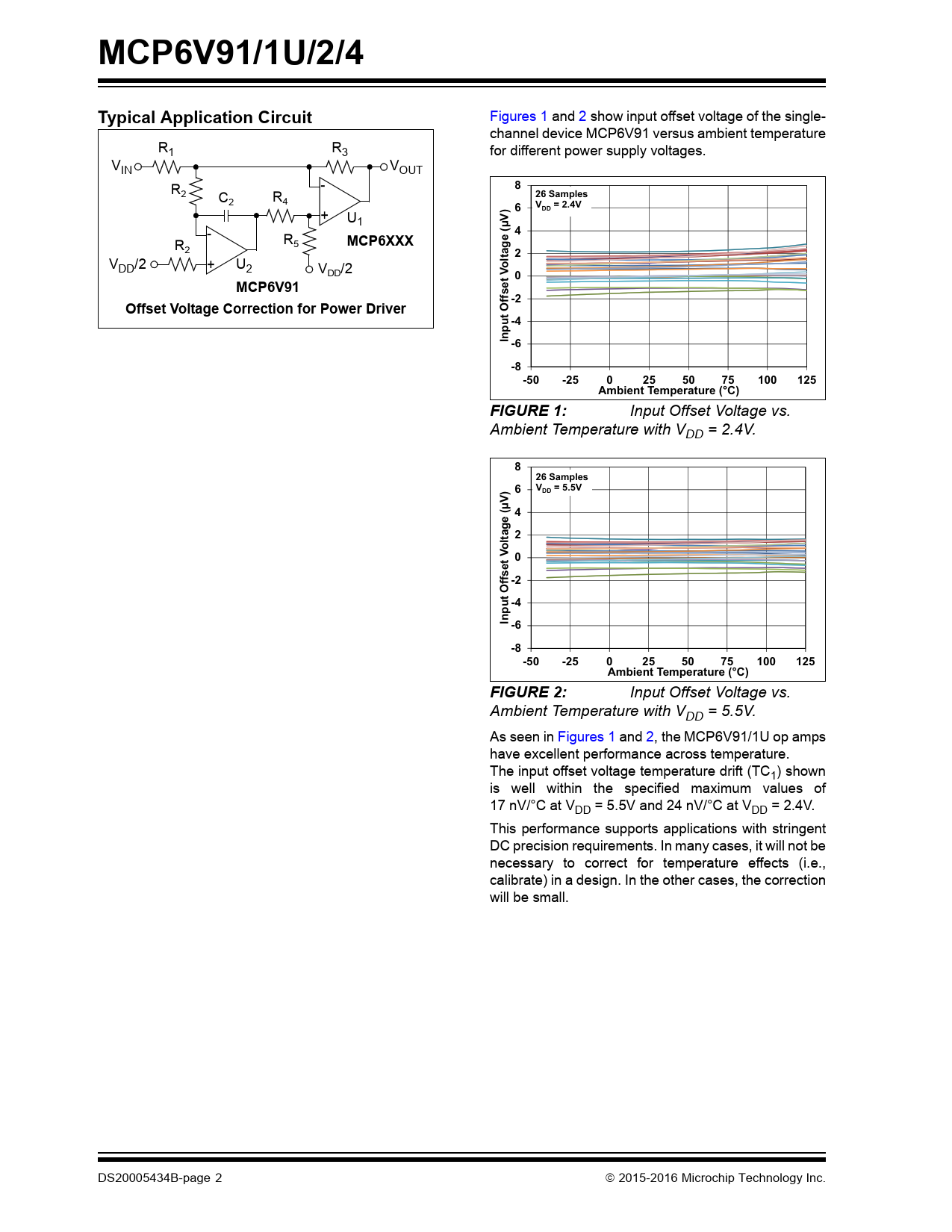 Input Offset Voltage vs. Ambient Temperature with VDD = 5.5V. As seen in Figures 1 and 2, the MCP6V91/1U op amps have excellent performance across temperature. The input offset voltage temperature drift (TC1) shown is well within the specified maximum values of 17 nV/°C at VDD = 5.5V and 24 nV/°C at VDD = 2.4V. This performance supports applications with stringent DC precision requirements. In many cases, it will not be necessary to correct for temperature effects (i.e., calibrate) in a design. In the other cases, the correction will be small. DS20005434B-page 2  2015-2016 Microchip Technology Inc. Document Outline 10 MHz, Zero-Drift Op Amps Features Typical Applications Design Aids Related Parts General Description Package Types Typical Application Circuit 1.0 Electrical Characteristics 1.1 Absolute Maximum Ratings 1.2 Specifications TABLE 1-1: DC Electrical Specifications TABLE 1-2: AC Electrical Specifications TABLE 1-3: Temperature Specifications 1.3 Timing Diagrams FIGURE 1-1: Amplifier Start-Up. FIGURE 1-2: Offset Correction Settling Time. FIGURE 1-3: Output Overdrive Recovery. 1.4 Test Circuits FIGURE 1-4: AC and DC Test Circuit for Most Noninverting Gain Conditions. FIGURE 1-5: AC and DC Test Circuit for Most Inverting Gain Conditions. FIGURE 1-6: Test Circuit for Dynamic Input Behavior. 2.0 Typical Performance Curves 2.1 DC Input Precision FIGURE 2-1: Input Offset Voltage. FIGURE 2-2: Input Offset Voltage Drift. FIGURE 2-3: Input Offset Voltage Quadratic Temperature Coefficient. FIGURE 2-4: Input Offset Voltage vs. Power Supply Voltage with VCM = VCML. FIGURE 2-5: Input Offset Voltage vs. Power Supply Voltage with VCM = VCMH. FIGURE 2-6: Input Offset Voltage vs. Output Voltage with VDD = 2.4V. FIGURE 2-7: Input Offset Voltage vs. Output Voltage with VDD = 5.5V. FIGURE 2-8: Input Offset Voltage vs. Common-Mode Voltage with VDD = 2.4V. FIGURE 2-9: Input Offset Voltage vs. Common-Mode Voltage with VDD = 5.5V. FIGURE 2-10: Common-Mode Rejection Ratio. FIGURE 2-11: Power Supply Rejection Ratio. FIGURE 2-12: DC Open-Loop Gain. FIGURE 2-13: CMRR and PSRR vs. Ambient Temperature. FIGURE 2-14: DC Open-Loop Gain vs. Ambient Temperature. FIGURE 2-15: Input Bias and Offset Currents vs. Common-Mode Input Voltage with TA = +85°C. FIGURE 2-16: Input Bias and Offset Currents vs. Common-Mode Input Voltage with TA = +125°C. FIGURE 2-17: Input Bias and Offset Currents vs. Ambient Temperature with VDD = 5.5V. FIGURE 2-18: Input Bias Current vs. Input Voltage (Below VSS). 2.2 Other DC Voltages and Currents FIGURE 2-19: Input Common-Mode Voltage Headroom (Range) vs. Ambient Temperature. FIGURE 2-20: Output Voltage Headroom vs. Output Current. FIGURE 2-21: Output Voltage Headroom vs. Ambient Temperature. FIGURE 2-22: Output Short-Circuit Current vs. Power Supply Voltage. FIGURE 2-23: Supply Current vs. Power Supply Voltage. FIGURE 2-24: Power-On Reset Trip Voltage. FIGURE 2-25: Power-On Reset Voltage vs. Ambient Temperature. 2.3 Frequency Response FIGURE 2-26: CMRR and PSRR vs. Frequency. FIGURE 2-27: Open-Loop Gain vs. Frequency with VDD = 2.4V. FIGURE 2-28: Open-Loop Gain vs. Frequency with VDD = 5.5V. FIGURE 2-29: Gain Bandwidth Product and Phase Margin vs. Ambient Temperature. FIGURE 2-30: Gain Bandwidth Product and Phase Margin vs. Common-Mode Input Voltage. FIGURE 2-31: Gain Bandwidth Product and Phase Margin vs. Output Voltage. FIGURE 2-32: Closed-Loop Output Impedance vs. Frequency with VDD = 2.2V. FIGURE 2-33: Closed-Loop Output Impedance vs. Frequency with VDD = 5.5V. FIGURE 2-34: Maximum Output Voltage Swing vs. Frequency. FIGURE 2-35: EMIRR vs. Frequency. FIGURE 2-36: EMIRR vs. Input Voltage. FIGURE 2-37: Channel-to Channel Separation vs. Frequency. 2.4 Input Noise and Distortion FIGURE 2-38: Input Noise Voltage Density and Integrated Input Noise Voltage vs. Frequency. FIGURE 2-39: Input Noise Voltage Density vs. Input Common-Mode Voltage. FIGURE 2-40: Intermodulation Distortion vs. Frequency with VCM Disturbance (see Figure 1-6). FIGURE 2-41: Intermodulation Distortion vs. Frequency with VDD Disturbance (see Figure 1-6). FIGURE 2-42: Input Noise vs. Time with 1 Hz and 10 Hz Filters and VDD = 2.4V. FIGURE 2-43: Input Noise vs. Time with 1 Hz and 10 Hz Filters and VDD = 5.5V. 2.5 Time Response FIGURE 2-44: Input Offset Voltage vs. Time with Temperature Change. FIGURE 2-45: Input Offset Voltage vs. Time at Power-Up. FIGURE 2-46: The MCP6V91/1U/2/4 Family Shows No Input Phase Reversal with Overdrive. FIGURE 2-47: Noninverting Small Signal Step Response. FIGURE 2-48: Noninverting Large Signal Step Response. FIGURE 2-49: Inverting Small Signal Step Response. FIGURE 2-50: Inverting Large Signal Step Response. FIGURE 2-51: Slew Rate vs. Ambient Temperature. FIGURE 2-52: Output Overdrive Recovery vs. Time with G = -10 V/V. FIGURE 2-53: Output Overdrive Recovery Time vs. Inverting Gain. 3.0 Pin Descriptions TABLE 3-1: Pin Function Table 3.1 Analog Outputs (VOUT, VOUTA, VOUTB, VOUTC, VOUTD) 3.2 Analog Inputs (VIN+, VIN-, VINB+, VINB-, VINC-, VINC+, VIND-, VIND+) 3.3 Power Supply Pins (VDD, VSS) 3.4 Exposed Thermal Pad (EP) 4.0 Applications 4.1 Overview of Zero-Drift Operation FIGURE 4-1: Simplified Zero-Drift Op Amp Functional Diagram. FIGURE 4-2: First Chopping Clock Phase; Equivalent Amplifier Diagram. FIGURE 4-3: Second Chopping Clock Phase; Equivalent Amplifier Diagram. 4.2 Other Functional Blocks FIGURE 4-4: Simplified Analog Input ESD Structures. FIGURE 4-5: Protecting the Analog Inputs Against High Voltages. FIGURE 4-6: Protecting the Analog Inputs Against High Currents. 4.3 Application Tips FIGURE 4-7: Output Resistor, RISO, Stabilizes Capacitive Loads. FIGURE 4-8: Recommended RISO Values for Capacitive Loads. FIGURE 4-9: Output Load. FIGURE 4-10: Amplifier with Parasitic Capacitance. 4.4 Typical Applications FIGURE 4-11: Simple Design. FIGURE 4-12: RTD Sensor. FIGURE 4-13: Offset Correction. FIGURE 4-14: Precision Comparator. 5.0 Design Aids 5.1 FilterLab® Software 5.2 Microchip Adv