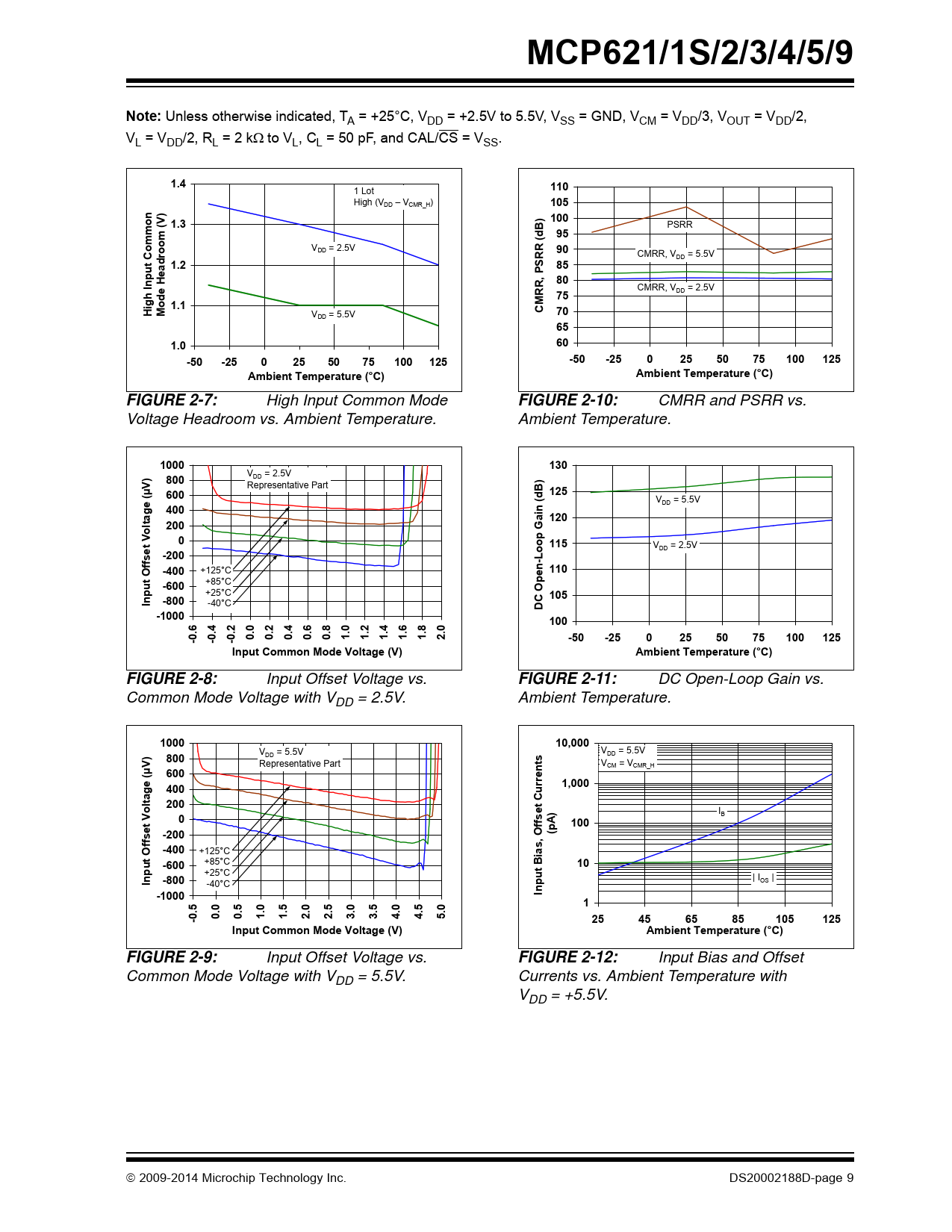 Input Bias and Offset Common Mode Voltage with VDD = 5.5V. Currents vs. Ambient Temperature with VDD = +5.5V.  2009-2014 Microchip Technology Inc. DS20002188D-page 9 Document Outline 20 MHz, 200 µV Op Amps with mCal Features Typical Applications Design Aids Description Typical Application Circuit High Gain-Bandwidth Op Amp Portfolio Package Types 1.0 Electrical Characteristics 1.1 Absolute Maximum Ratings † 1.2 Specifications TABLE 1-1: DC Electrical Specifications TABLE 1-2: AC Electrical Specifications TABLE 1-3: Digital Electrical Specifications TABLE 1-4: Temperature Specifications 1.3 Timing Diagram FIGURE 1-1: Timing Diagram. 1.4 Test Circuits FIGURE 1-2: AC and DC Test Circuit for Most Specifications. 2.0 Typical Performance Curves 2.1 DC Signal Inputs FIGURE 2-1: Input Offset Voltage. FIGURE 2-2: Input Offset Voltage Drift. FIGURE 2-3: Input Offset Voltage Repeatability (repeated calibration). FIGURE 2-4: Input Offset Voltage vs. Power Supply Voltage. FIGURE 2-5: Input Offset Voltage vs. Output Voltage. FIGURE 2-6: Low Input Common Mode Voltage Headroom vs. Ambient Temperature. FIGURE 2-7: High Input Common Mode Voltage Headroom vs. Ambient Temperature. FIGURE 2-8: Input Offset Voltage vs. Common Mode Voltage with VDD = 2.5V. FIGURE 2-9: Input Offset Voltage vs. Common Mode Voltage with VDD = 5.5V. FIGURE 2-10: CMRR and PSRR vs. Ambient Temperature. FIGURE 2-11: DC Open-Loop Gain vs. Ambient Temperature. FIGURE 2-12: Input Bias and Offset Currents vs. Ambient Temperature with VDD = +5.5V. FIGURE 2-13: Input Bias and Offset Currents vs. Common Mode Input Voltage with TA = +85°C. FIGURE 2-14: Input Bias and Offset Currents vs. Common Mode Input Voltage with TA = +125°C. FIGURE 2-15: Input Bias Current vs. Input Voltage (below VSS). 2.2 Other DC Voltages and Currents FIGURE 2-16: Ratio of Output Voltage Headroom to Output Current. FIGURE 2-17: Output Voltage Headroom vs. Ambient Temperature. FIGURE 2-18: Output Short-Circuit Current vs. Power Supply Voltage. FIGURE 2-19: Supply Current vs. Power Supply Voltage. FIGURE 2-20: Supply Current vs. Common Mode Input Voltage. FIGURE 2-21: Power-On Reset Voltages vs. Ambient Temperature. FIGURE 2-22: Normalized Internal Calibration Voltage. FIGURE 2-23: VCAL Input Resistance vs. Temperature. 2.3 Frequency Response FIGURE 2-24: CMRR and PSRR vs. Frequency. FIGURE 2-25: Open-Loop Gain vs. Frequency. FIGURE 2-26: Gain Bandwidth Product and Phase Margin vs. Ambient Temperature. FIGURE 2-27: Gain Bandwidth Product and Phase Margin vs. Common Mode Input Voltage. FIGURE 2-28: Gain Bandwidth Product and Phase Margin vs. Output Voltage. FIGURE 2-29: Closed-Loop Output Impedance vs. Frequency. FIGURE 2-30: Gain Peaking vs. Normalized Capacitive Load. FIGURE 2-31: Channel-to-Channel Separation vs. Frequency. 2.4 Input Noise and Distortion FIGURE 2-32: Input Noise Voltage Density vs. Frequency. FIGURE 2-33: Input Noise Voltage Density vs. Input Common Mode Voltage with f = 100 Hz. FIGURE 2-34: Input Noise Voltage Density vs. Input Common Mode Voltage with f = 1 MHz. FIGURE 2-35: Input Noise plus Offset vs. Time with 0.1 Hz Filter. FIGURE 2-36: THD+N vs. Frequency. 2.5 Time Response FIGURE 2-37: Non-Inverting Small Signal Step Response. FIGURE 2-38: Non-Inverting Large Signal Step Response. FIGURE 2-39: Inverting Small Signal Step Response. FIGURE 2-40: Inverting Large Signal Step Response. FIGURE 2-41: The MCP621/1S/2/3/4/5/9 Family Shows No Input Phase Reversal with Overdrive. FIGURE 2-42: Slew Rate vs. Ambient Temperature. FIGURE 2-43: Maximum Output Voltage Swing vs. Frequency. 2.6 Calibration and Chip Select Response FIGURE 2-44: CAL/CS Current vs. Power Supply Voltage. FIGURE 2-45: CAL/CS Voltage, Output Voltage and Supply Current (for Side A) vs. Time with VDD = 2.5V. FIGURE 2-46: CAL/CS Voltage, Output Voltage and Supply Current (for Side A) vs. Time with VDD = 5.5V. FIGURE 2-47: CAL/CS Hysteresis vs. Ambient Temperature. FIGURE 2-48: CAL/CS Turn-On Time vs. Ambient Temperature. FIGURE 2-49: CAL/CS’s Pull-Down Resistor (RPD) vs. Ambient Temperature. FIGURE 2-50: Quiescent Current in Shutdown vs. Power Supply Voltage. FIGURE 2-51: Output Leakage Current vs. Output Voltage. 3.0 Pin Descriptions TABLE 3-1: Pin Function Table 3.1 Analog Outputs 3.2 Analog Inputs 3.3 Power Supply Pins 3.4 Calibration Common Mode Voltage Input 3.5 Calibrate/Chip Select Digital Input 3.6 Exposed Thermal Pad (EP) 4.0 Applications 4.1 Calibration and Chip Select FIGURE 4-1: Common-Mode Reference’s Input Circuitry. FIGURE 4-2: Setting VCM with External Resistors. 4.2 Input FIGURE 4-3: Simplified Analog Input ESD Structures. FIGURE 4-4: Protecting the Analog Inputs. FIGURE 4-5: Unity Gain Voltage Limitations for Linear Operation. 4.3 Rail-to-Rail Output FIGURE 4-6: Output Current. FIGURE 4-7: Diagram for Resistive Load Power Calculations. FIGURE 4-8: Diagram for Capacitive Load Power Calculations. 4.4 Improving Stability FIGURE 4-9: Output Resistor, RISO Stabilizes Large Capacitive Loads. FIGURE 4-10: Recommended RISO Values for Capacitive Loads. FIGURE 4-11: Amplifier with Parasitic Capacitance. FIGURE 4-12: Maximum Recommended RF vs. Gain. 4.5 Power Supply 4.6 High Speed PCB Layout 4.7 Typical Applications FIGURE 4-13: Power Driver. FIGURE 4-14: Transimpedance Amplifier for an Optical Detector. FIGURE 4-15: H-Bridge Driver. 5.0 Design Aids 5.1 SPICE Macro Model 5.2 FilterLab® Software 5.3 Microchip Advanced Part Selector (MAPS) 5.4 Analog Demonstration and Evaluation Boards 5.5 Application Notes 6.0 Packaging Information 6.1 Package Marking Information Appendix A: Revision History Product Identification System Trademarks Worldwide Sales and Service