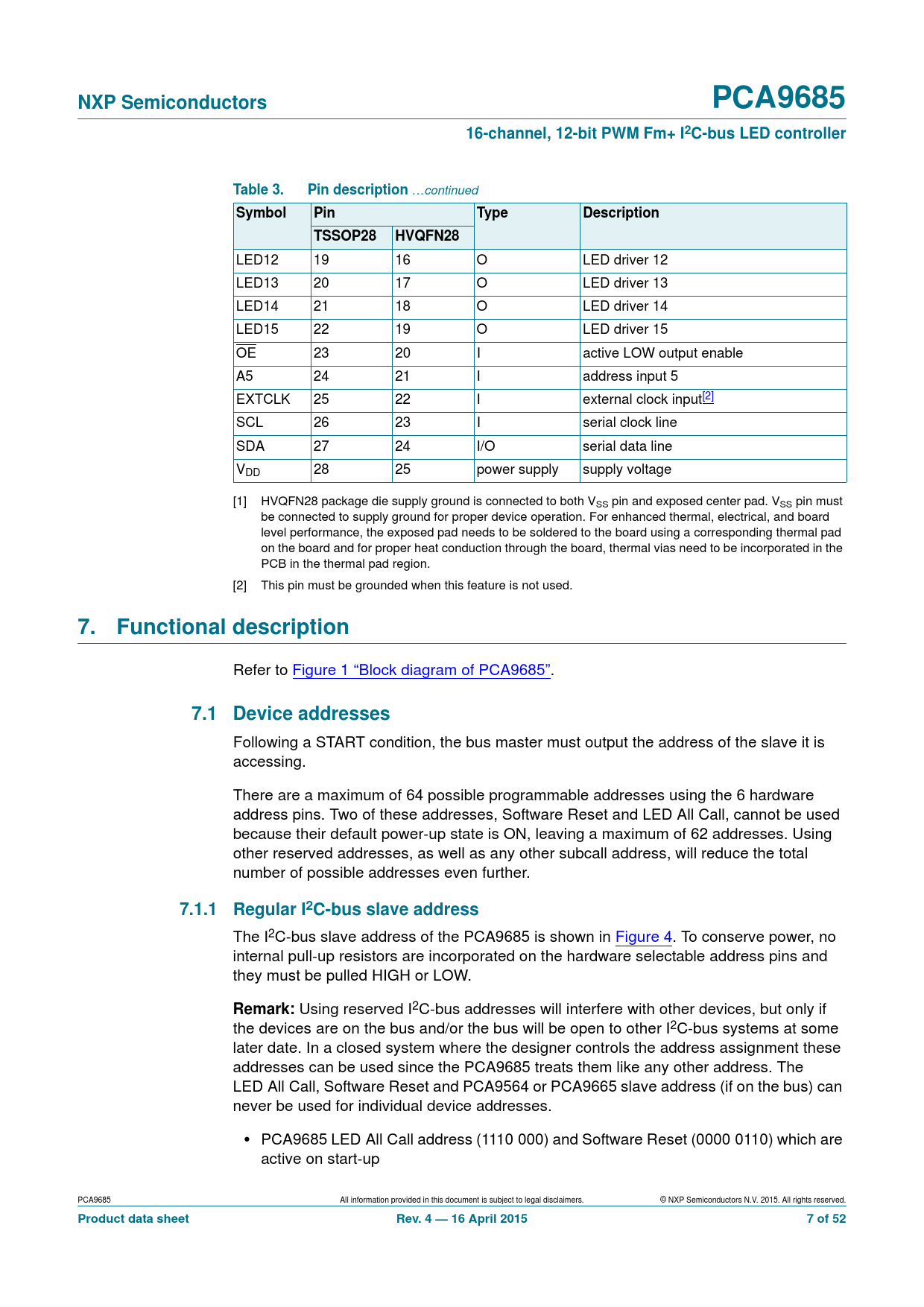 LED12 19 16 O LED driver 12 LED13 20 17 O LED driver 13 LED14 21 18 O LED driver 14 LED15 22 19 O LED driver 15 OE 23 20 I active LOW output enable A5 24 21 I address input 5 EXTCLK 25 22 I external clock input[2] SCL 26 23 I serial clock line SDA 27 24 I/O serial data line VDD 28 25 power supply supply voltage [1] HVQFN28 package die supply ground is connected to both VSS pin and exposed center pad. VSS pin must be connected to supply ground for proper device operation. For enhanced thermal, electrical, and board level performance, the exposed pad needs to be soldered to the board using a corresponding thermal pad on the board and for proper heat conduction through the board, thermal vias need to be incorporated in the PCB in the thermal pad region. [2] This pin must be grounded when this feature is not used.