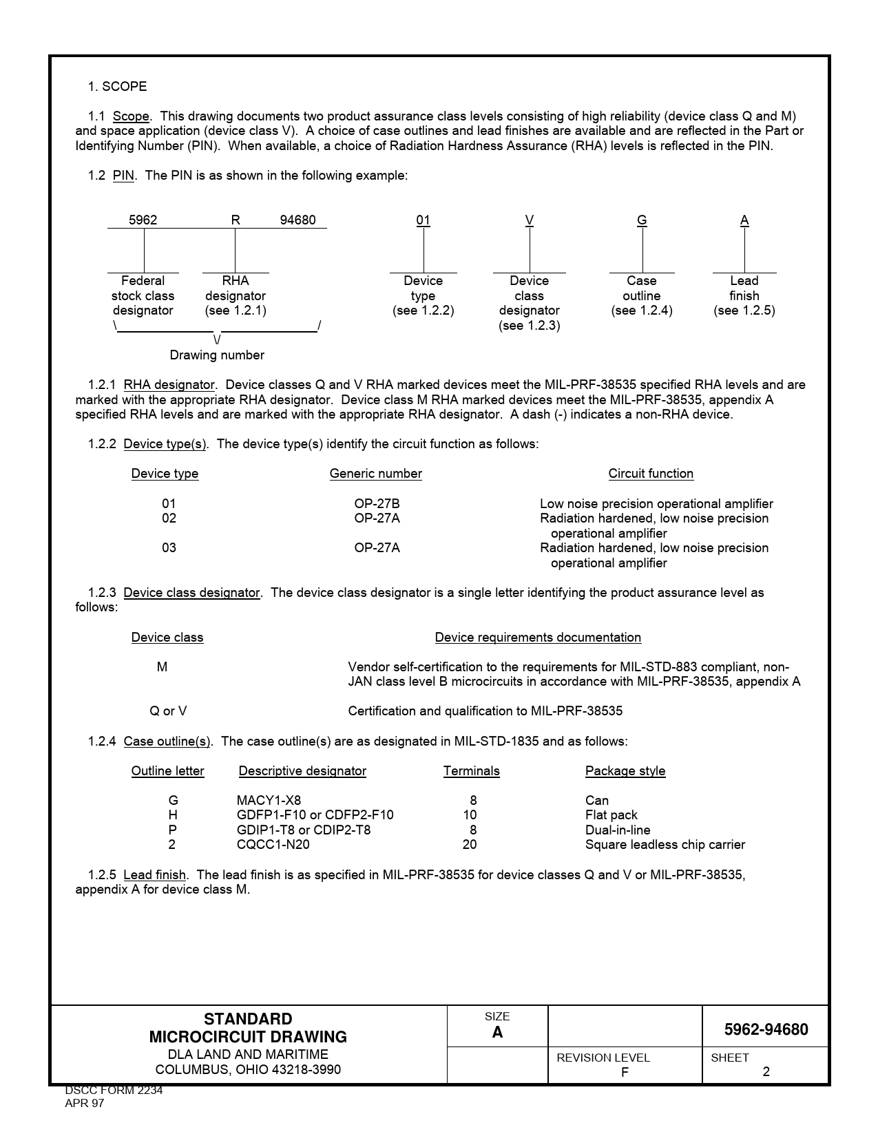 1. SCOPE 1.1 Scope. This drawing documents two product assurance class levels consisting of high reliability (device class Q and M) and space application (device class V). A choice of case outlines and lead finishes are available and are reflected in the Part or Identifying Number (PIN). When available, a choice of Radiation Hardness Assurance (RHA) levels is reflected in the PIN. 1.2 PIN. The PIN is as shown in the following example: 5962 R 94680 01 V G A Federal RHA Device Device Case Lead stock class designator type class outline finish designator (see 1.2.1) (see 1.2.2) designator (see 1.2.4) (see 1.2.5) \ / (see 1.2.3) \/ Drawing number 1.2.1 RHA designator. Device classes Q and V RHA marked devices meet the MIL-PRF-38535 specified RHA levels and are marked with the appropriate RHA designator. Device class M RHA marked devices meet the MIL-PRF-38535, appendix A specified RHA levels and are marked with the appropriate RHA designator. A dash (-) indicates a non-RHA device. 1.2.2 Device type(s). The device type(s) identify the circuit function as follows: Device type Generic number Circuit function 01 OP-27B Low noise precision operational amplifier 02 OP-27A Radiation hardened, low noise precision operational amplifier 03 OP-27A Radiation hardened, low noise precision operational amplifier 1.2.3 Device class designator. The device class designator is a single letter identifying the product assurance level as follows: Device class Device requirements documentation M Vendor self-certification to the requirements for MIL-STD-883 compliant, non- JAN class level B microcircuits in accordance with MIL-PRF-38535, appendix A Q or V Certification and qualification to MIL-PRF-38535 1.2.4 Case outline(s). The case outline(s) are as designated in MIL-STD-1835 and as follows: Outline letter Descriptive designator Terminals Package style G MACY1-X8 8 Can H GDFP1-F10 or CDFP2-F10 10 Flat pack P GDIP1-T8 or CDIP2-T8 8 Dual-in-line 2 CQCC1-N20 20 Square leadless chip carrier 1.2.5 Lead finish. The lead finish is as specified in MIL-PRF-38535 for device classes Q and V or MIL-PRF-38535, appendix A for device class M.